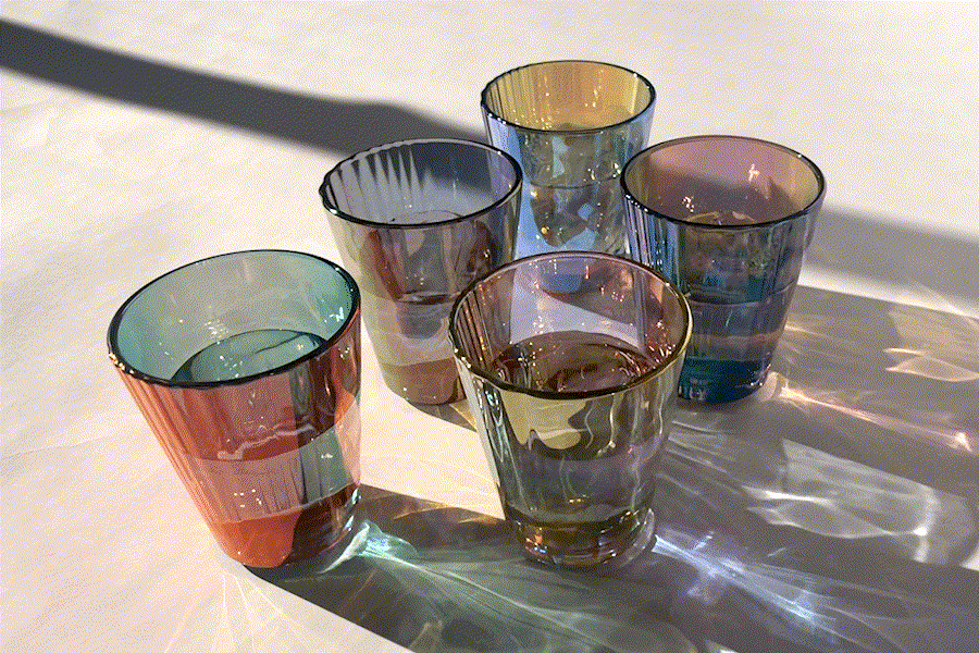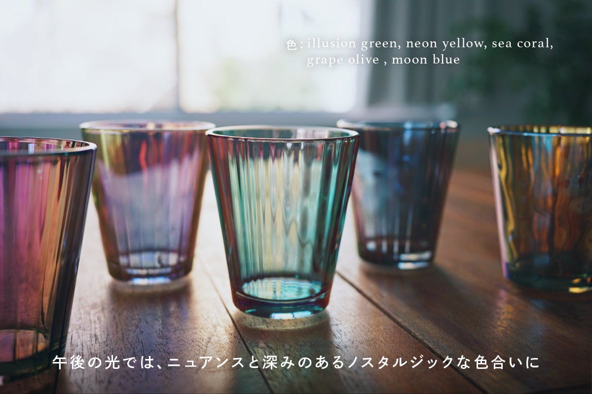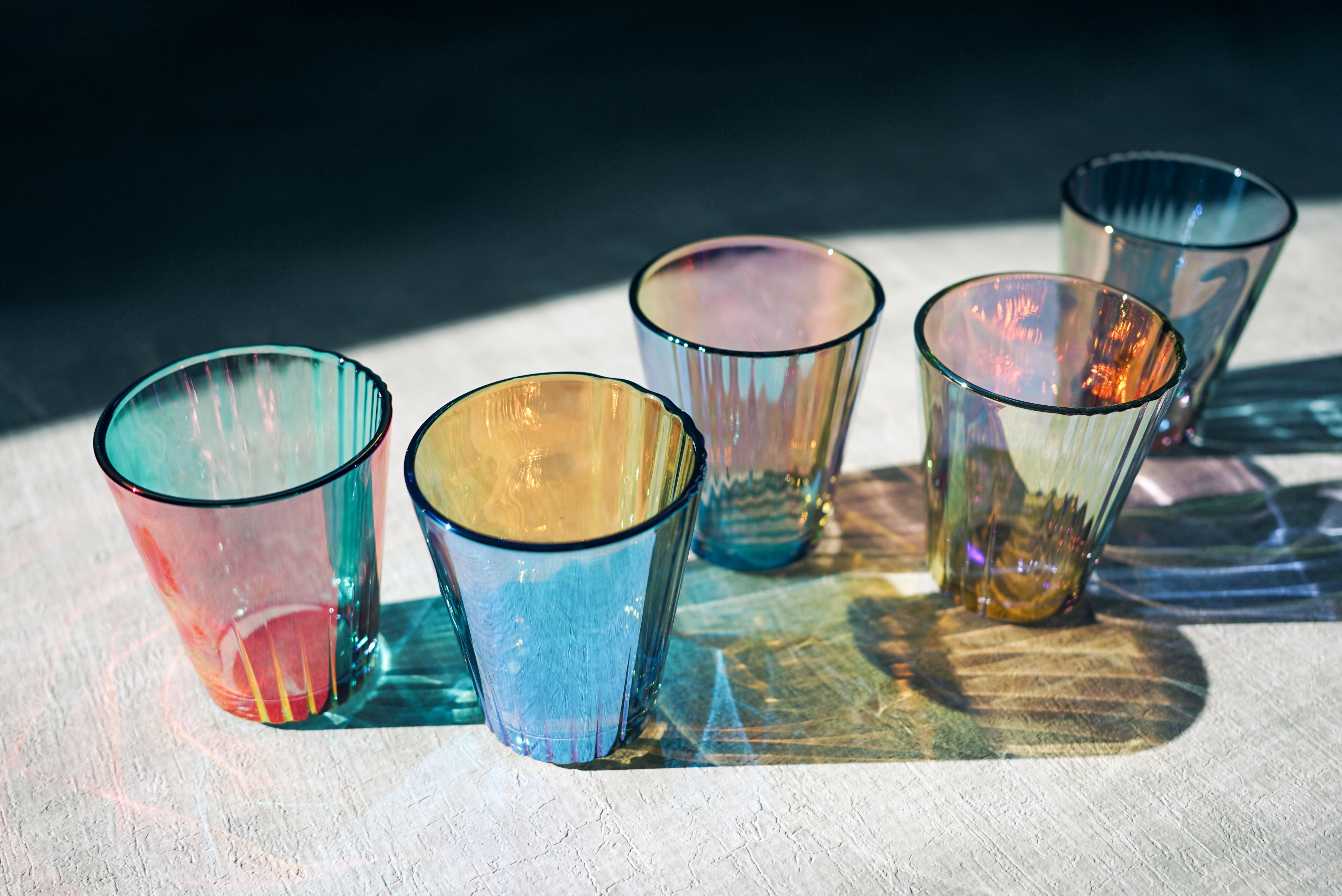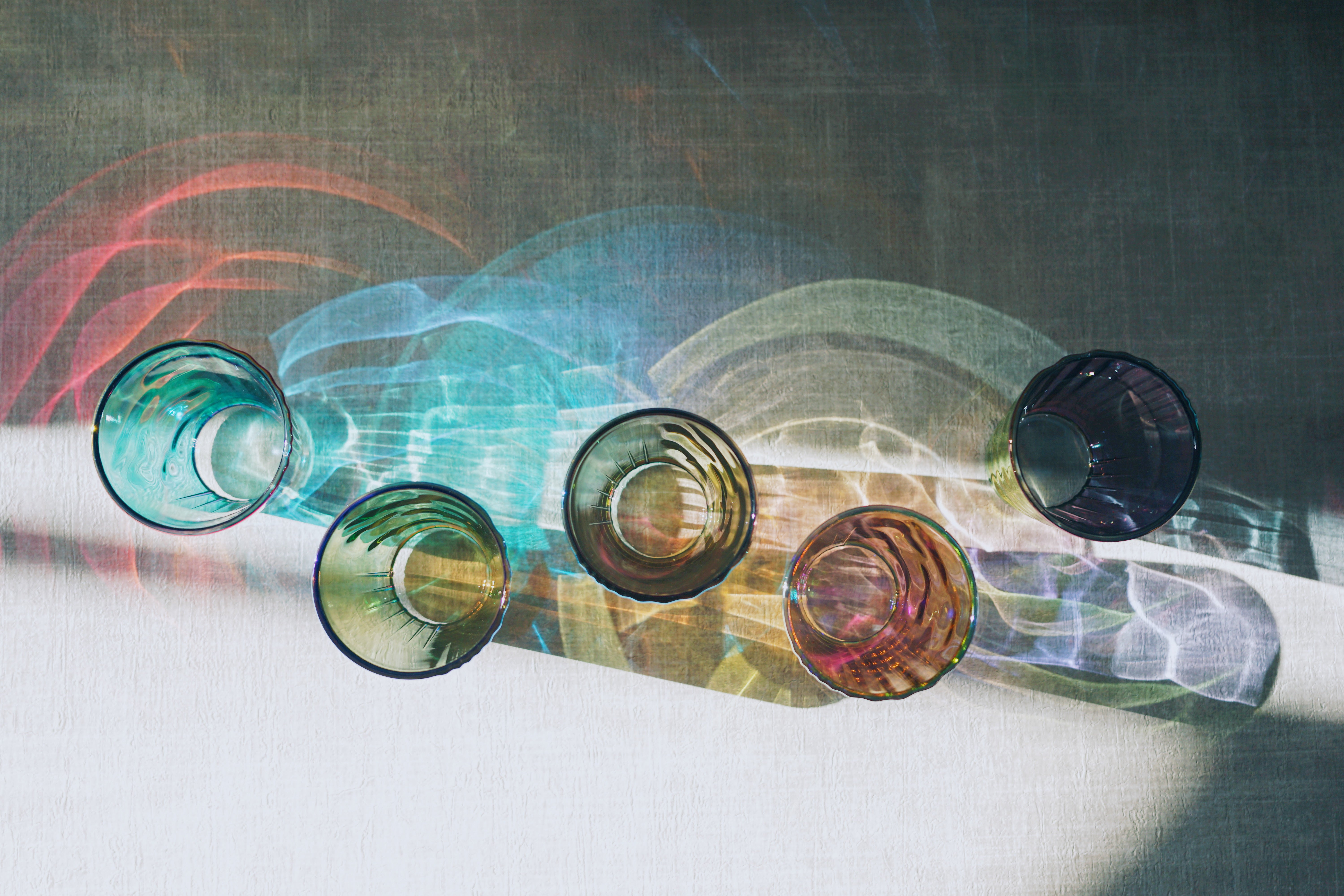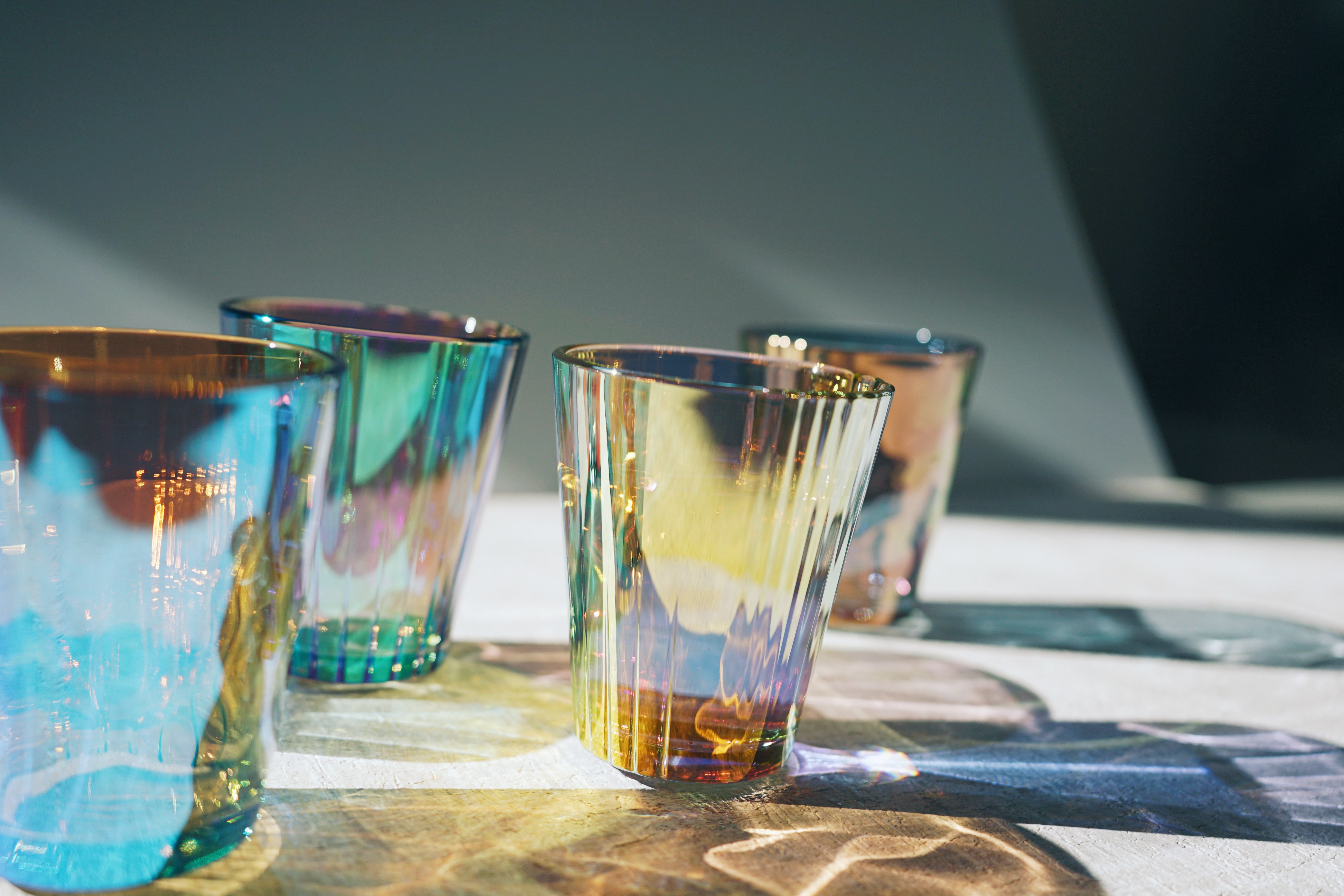 第一弾商品「yura glass(ユラグラス)」は、〈底面の丸み〉によってゆらゆら揺れるグラスです。ガラスの表面へ100万分の1 ミリ単位でコントロールされた薄い膜をコーティングする蒸着技術によって、光の干渉を利用した不思議な色を生み出し、光の当たり方や見る角度・時間帯、置く場所や入れるものによって様々な色味に美しく変化します。