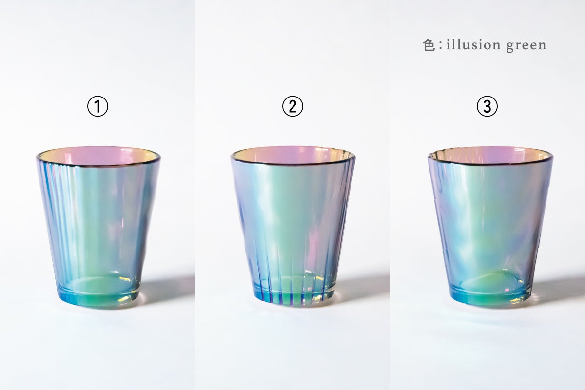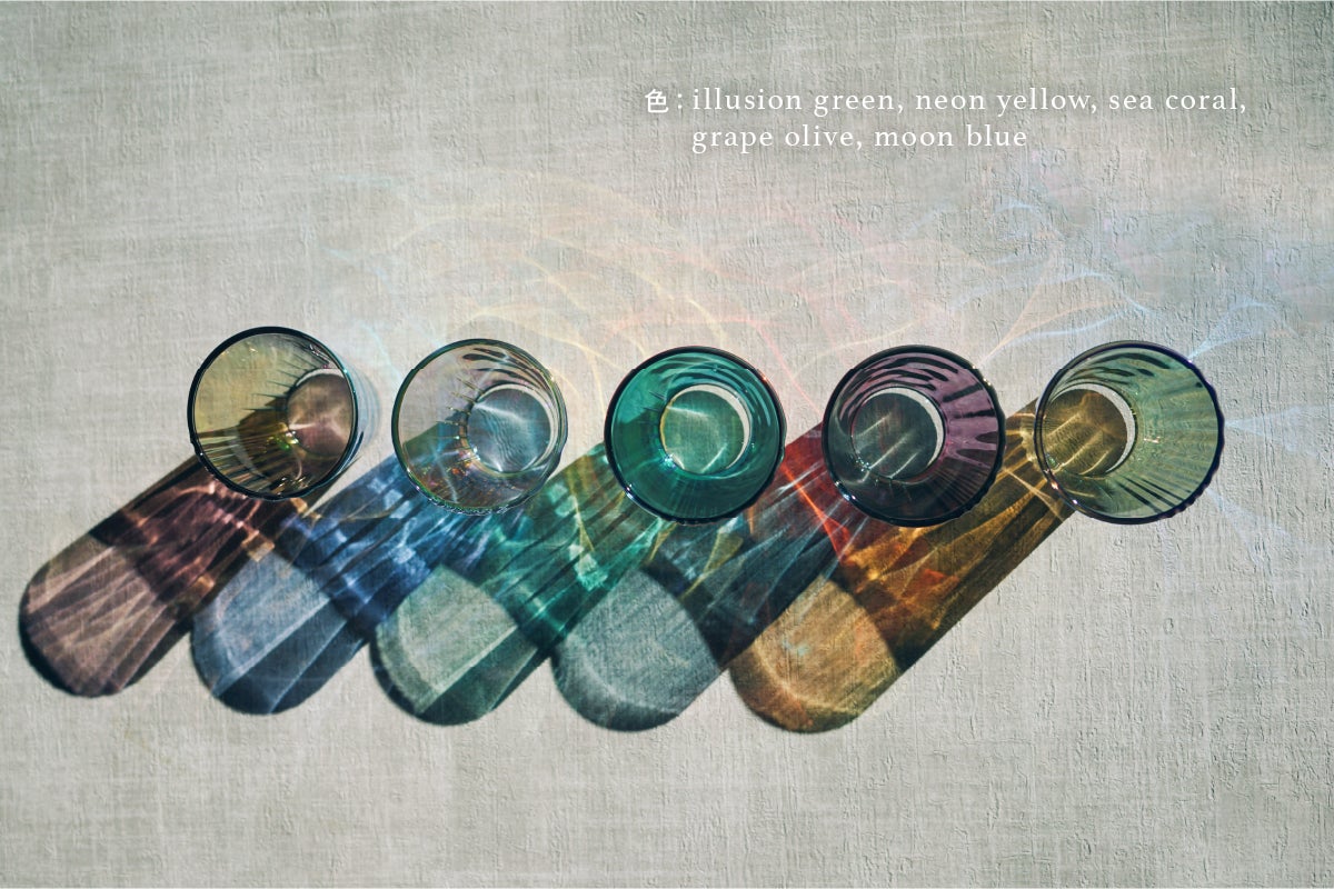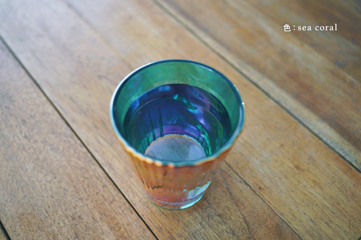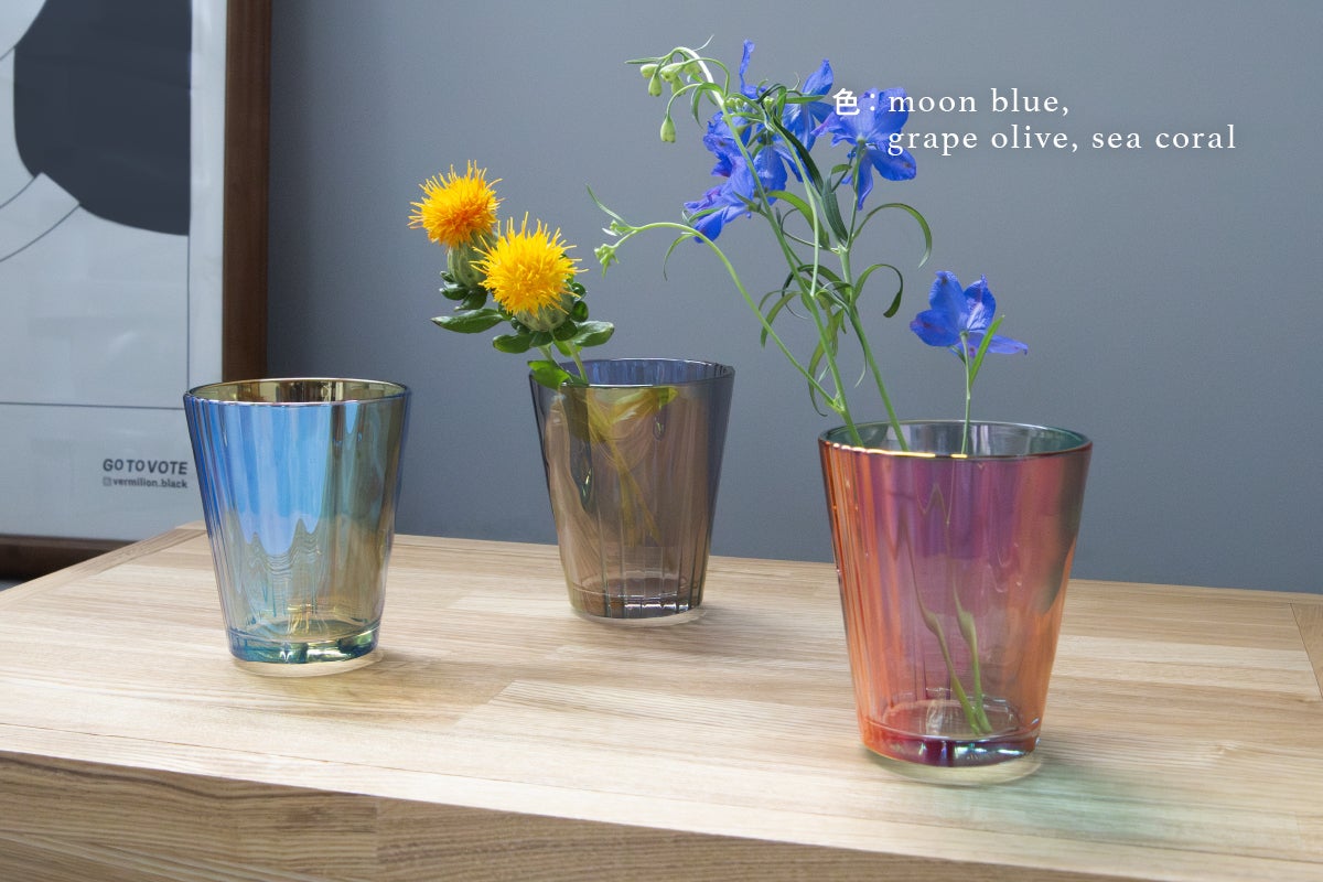 グラスは外側の色と内側の色が互いに補色の関係をもつバイカラーとなっていますが、とくに順光と逆光では劇的に見え方が変わり、順光(日向側)では外側の色がメタリックに反射し、逆光(陰側)からは内側の色が透けて見える不思議な変化を見せます。