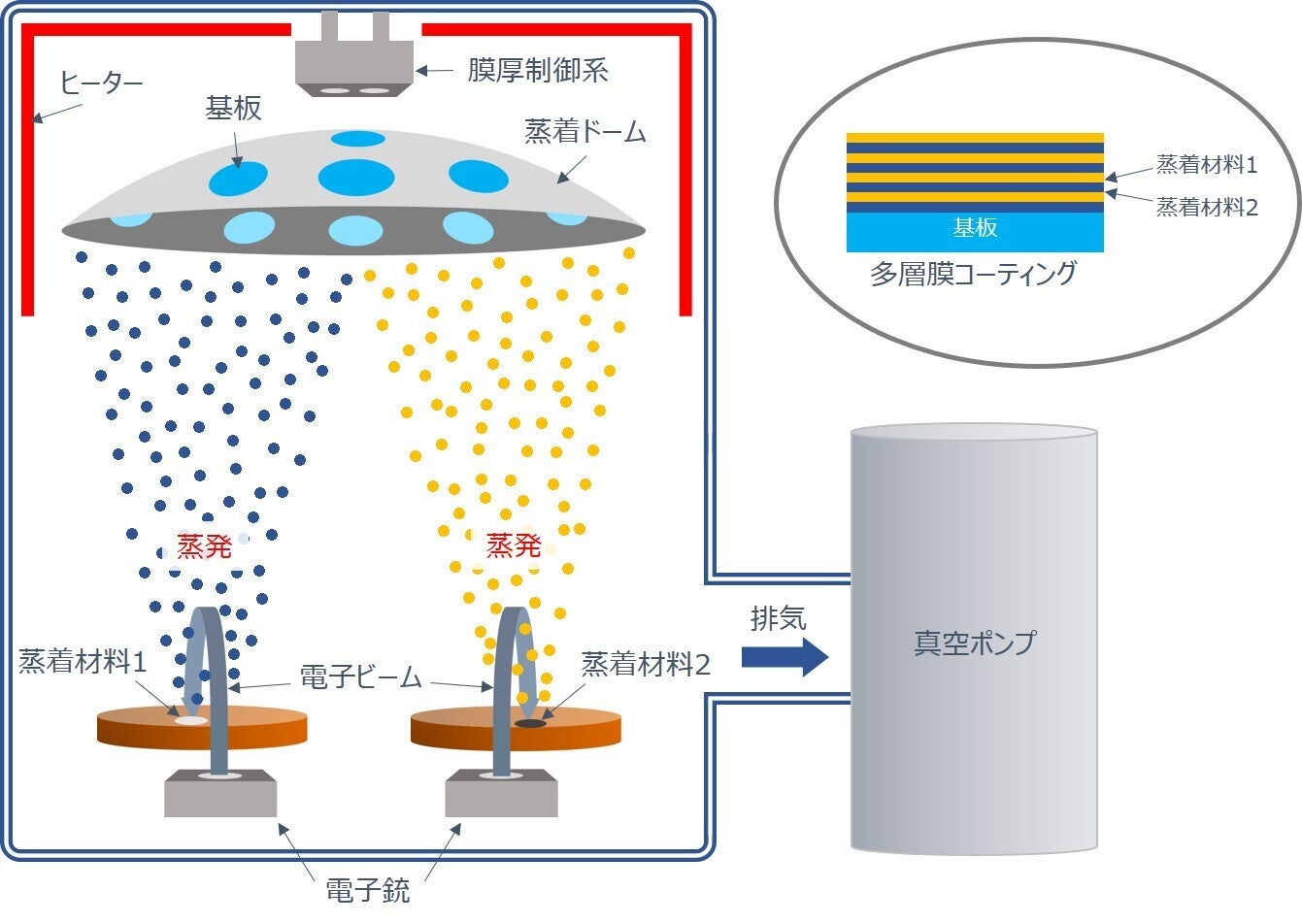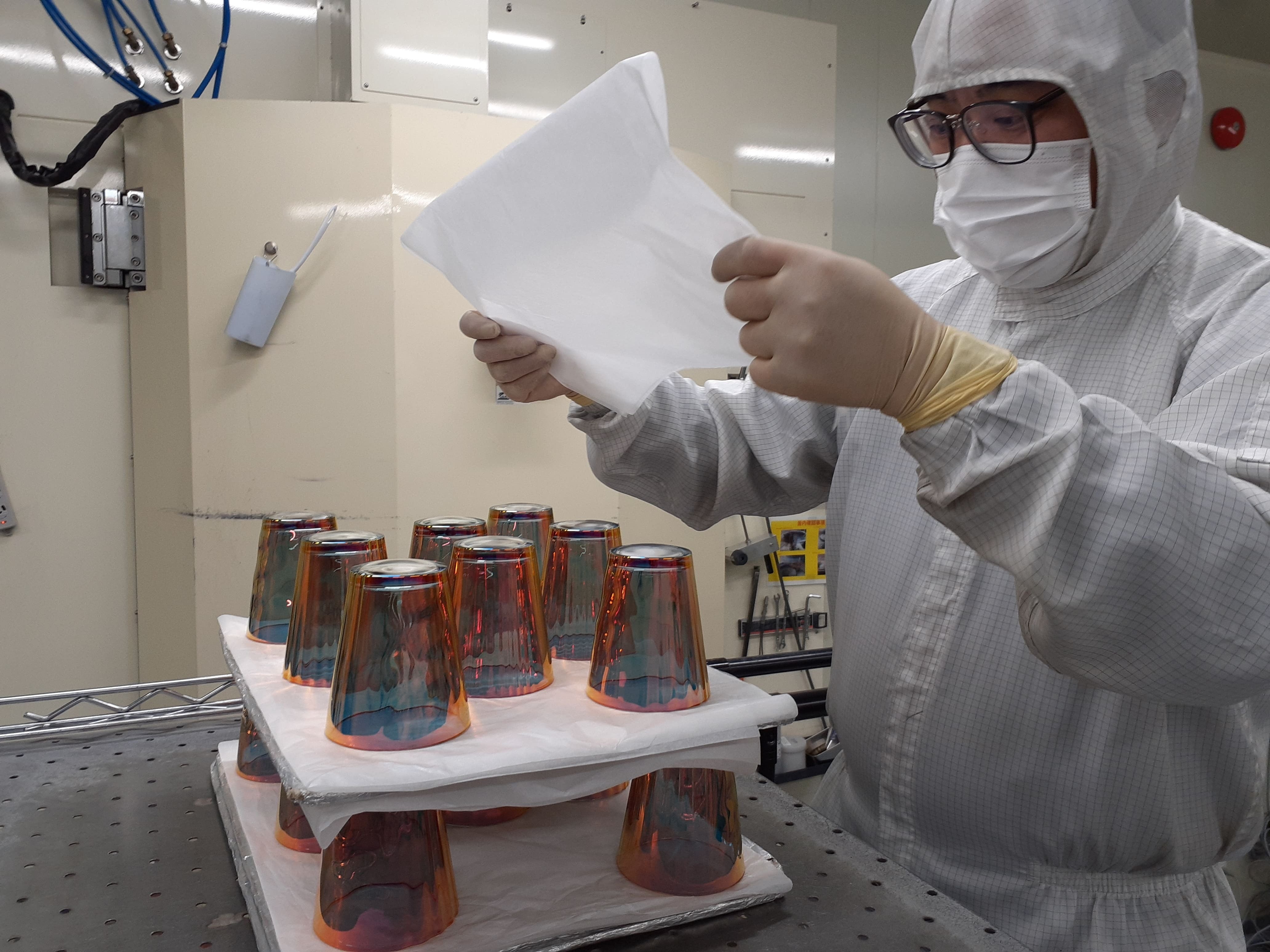 そして「蒸着」とは、真空中で蒸発させた材料を対象物に付着させるコーティング方法。ガラスの表面に屈折率の違う金属材料の薄い膜を交互に重ね、光の干渉を利用して任意の光の波長を反射/透過させることでさまざまな色を生み出し、光学的な機能や意匠性を付加します。岡本硝子で生産しているプロジェクター用の反射鏡やレンズは、この蒸着技術によって支えられています。身近なところでは、虹色に反射するサングラスのミラーレンズなどにも使われる技術です。