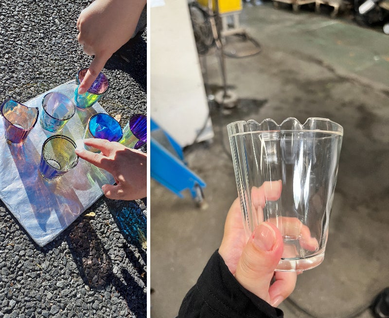 左)光の当たり具合を見たり……。 右)一番初めのグラスサンプル