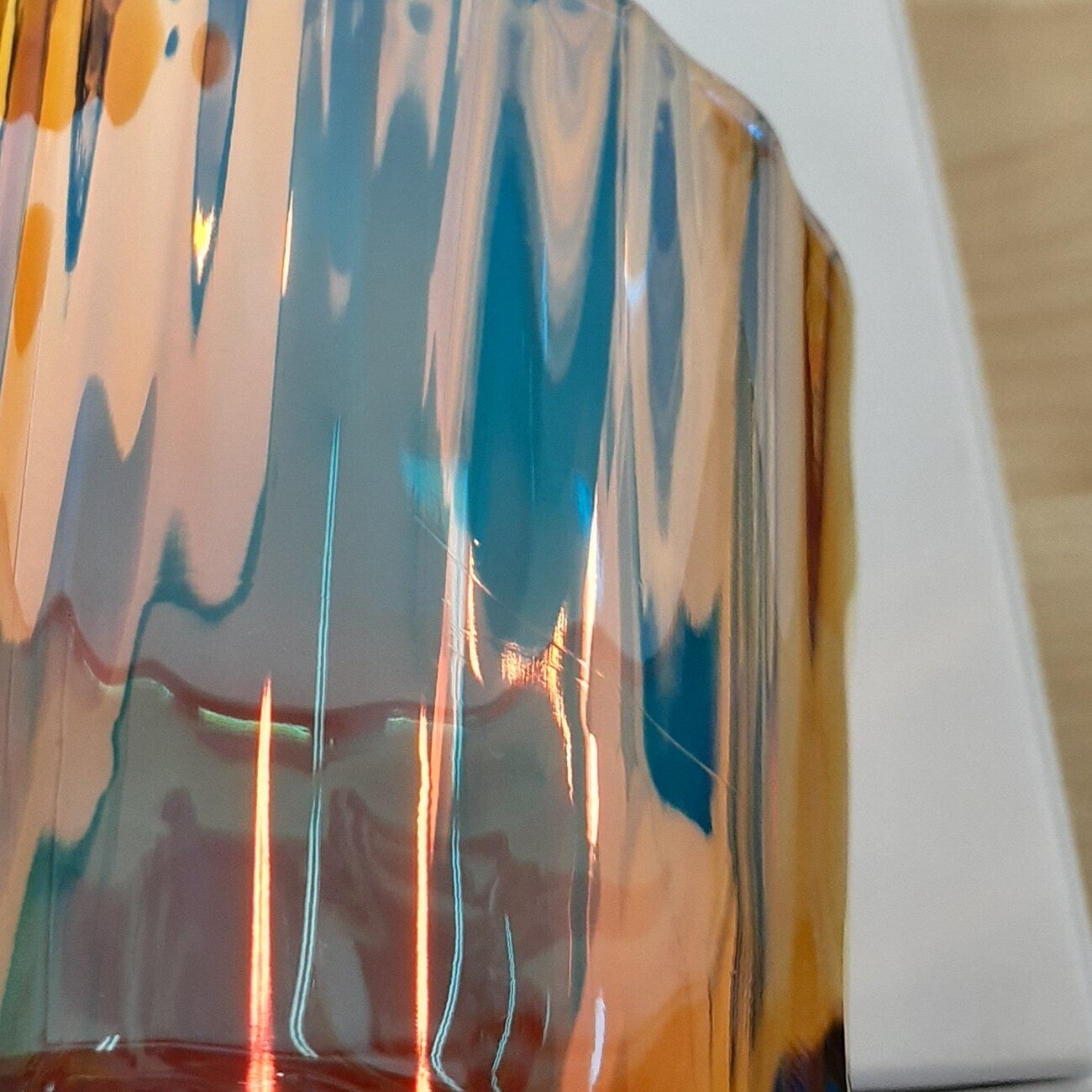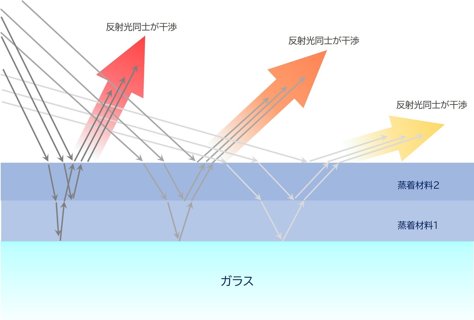 ガラスの表面にナノオーダーで厚みを制御した多層膜をコーティングする事で、膜界面での反射光同士の干渉が独自の色を作り出します。光の入射角度によって干渉する光の波長が変化しますので、光が当たる角度や見る角度を変えることで色の変化をお楽しみいただけます。また、yura glassの表面に形成された 「揺らぎ」 形状によって光の入射角度が変わりますので、これも色合いの変化をもたらします。
