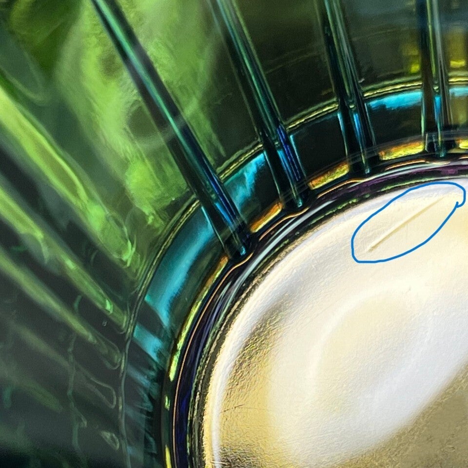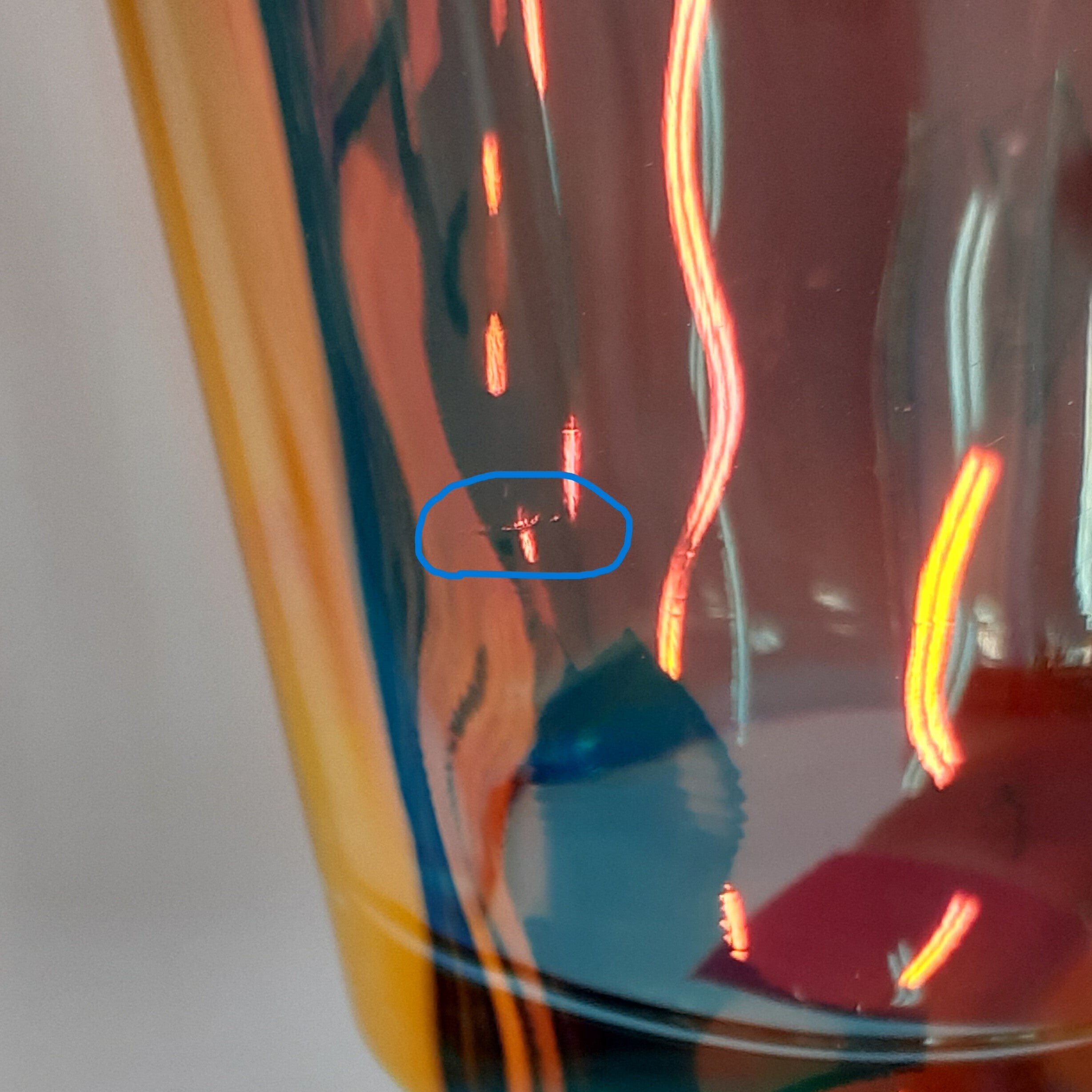 職人がガラスを巻き取り金型に供給するときに、巻いた部分がスジとなり製品に現れることがあります。また、ガラスを溶かすときに使用する坩堝(るつぼ)からの混入物や材料の溶け残りがプレスされる際にひきのばされてスジとなることもあります。