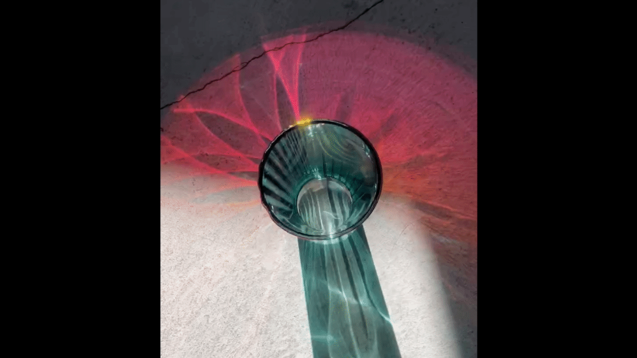 光のあたる場所にグラスを置くと、日向側には外側の色の反射模様が、日陰側には内側の色の影が現れて、2色の美しいコントラストが楽しめます。