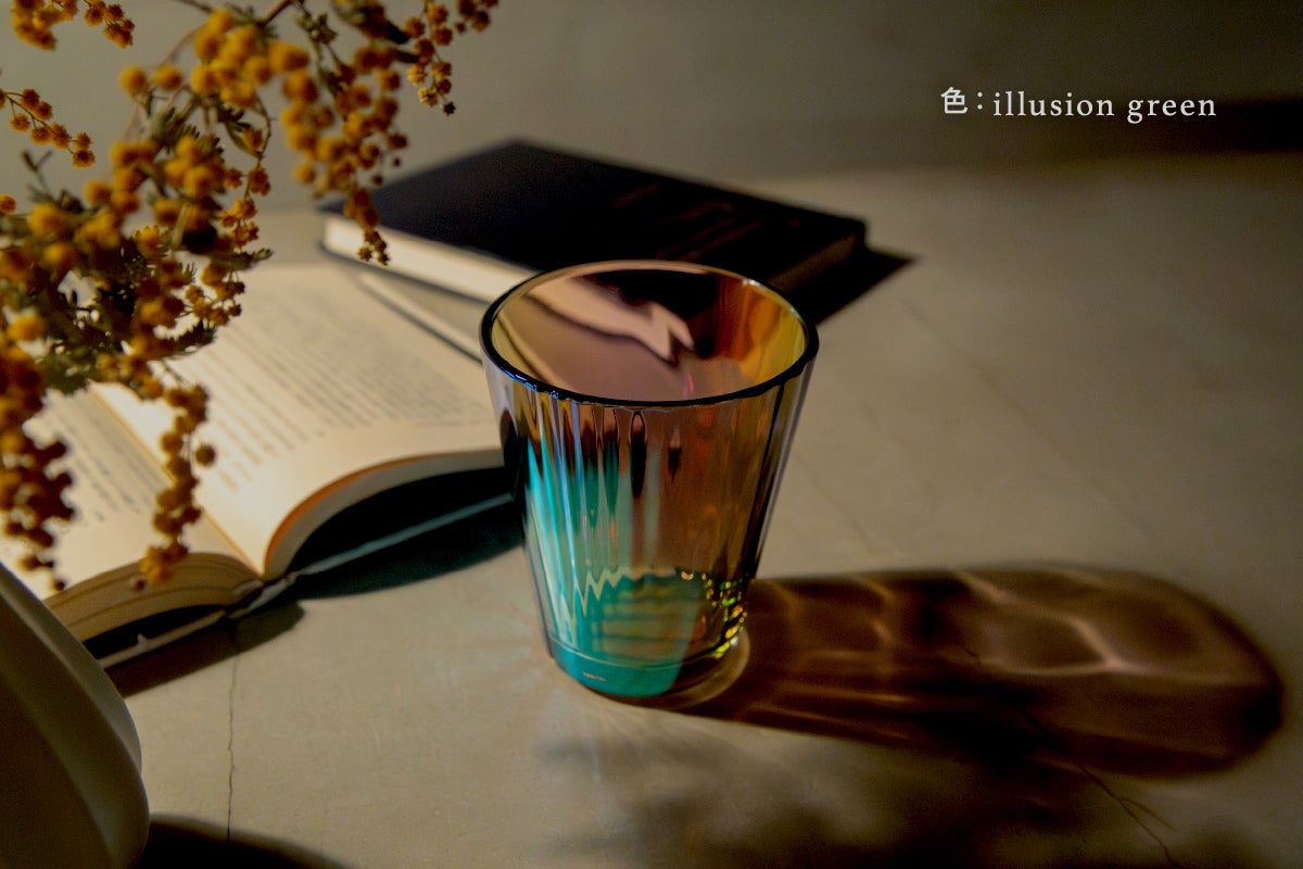 illumiiro というブランド名は、「光」を意味するillumiと「色」iro を合わせた造語。岡本硝子が創業以来受け継いできた「成型」と「蒸着」の高い技術を詰め込み、日々の暮らしに〈光と色の美しさ〉をもたらすプロダクトをお届けしたいという願いが込められています。