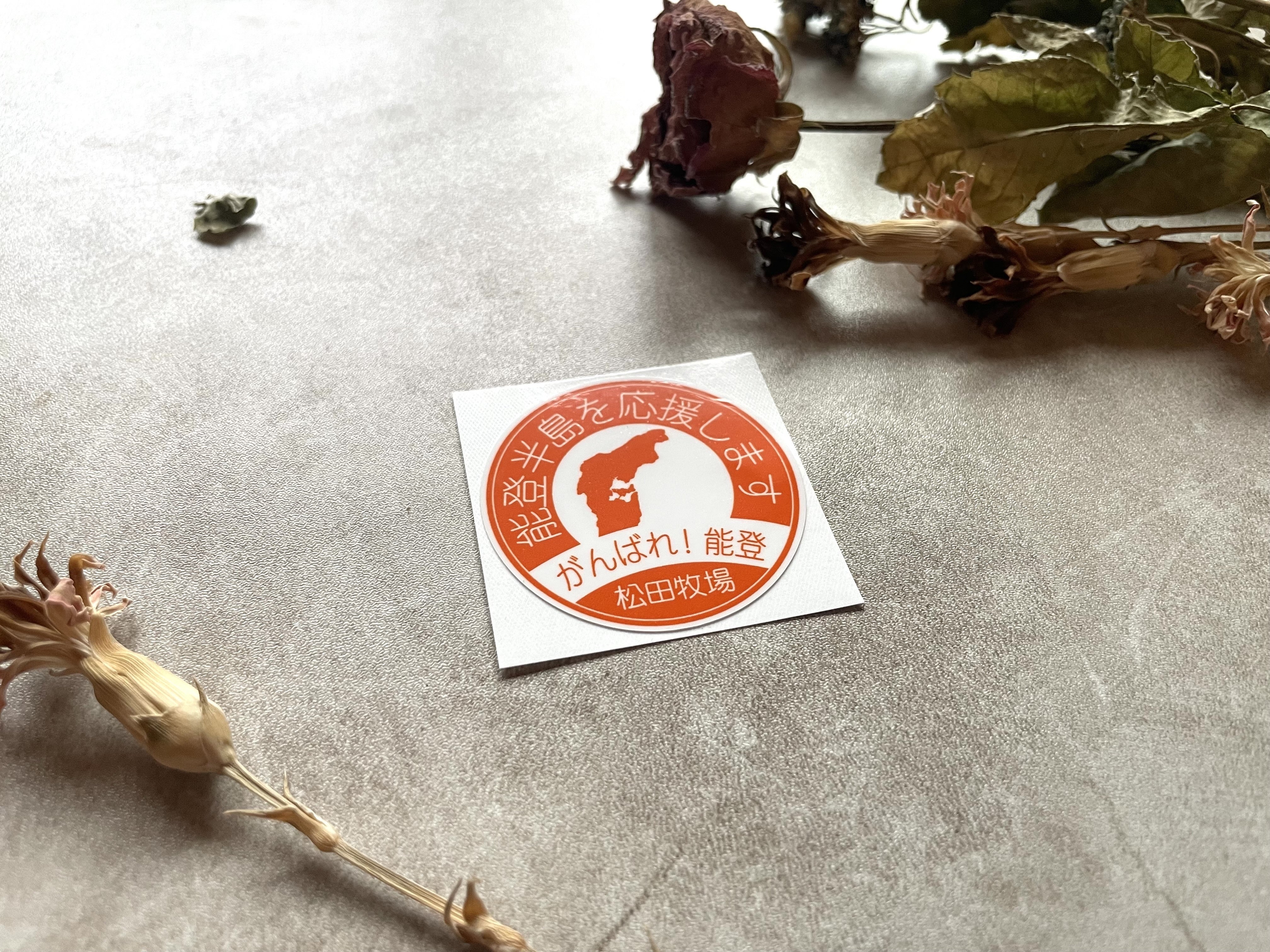 こちらのステッカーは、このクラウドファンディングの返礼品として、珠洲市在住のデザイナーに特別に作っていただいた非売品なので他では手に入りません。ぜひスマホやパソコン、ノートなどに貼って応援してください(ステッカーのサイズ直径:48mm)。