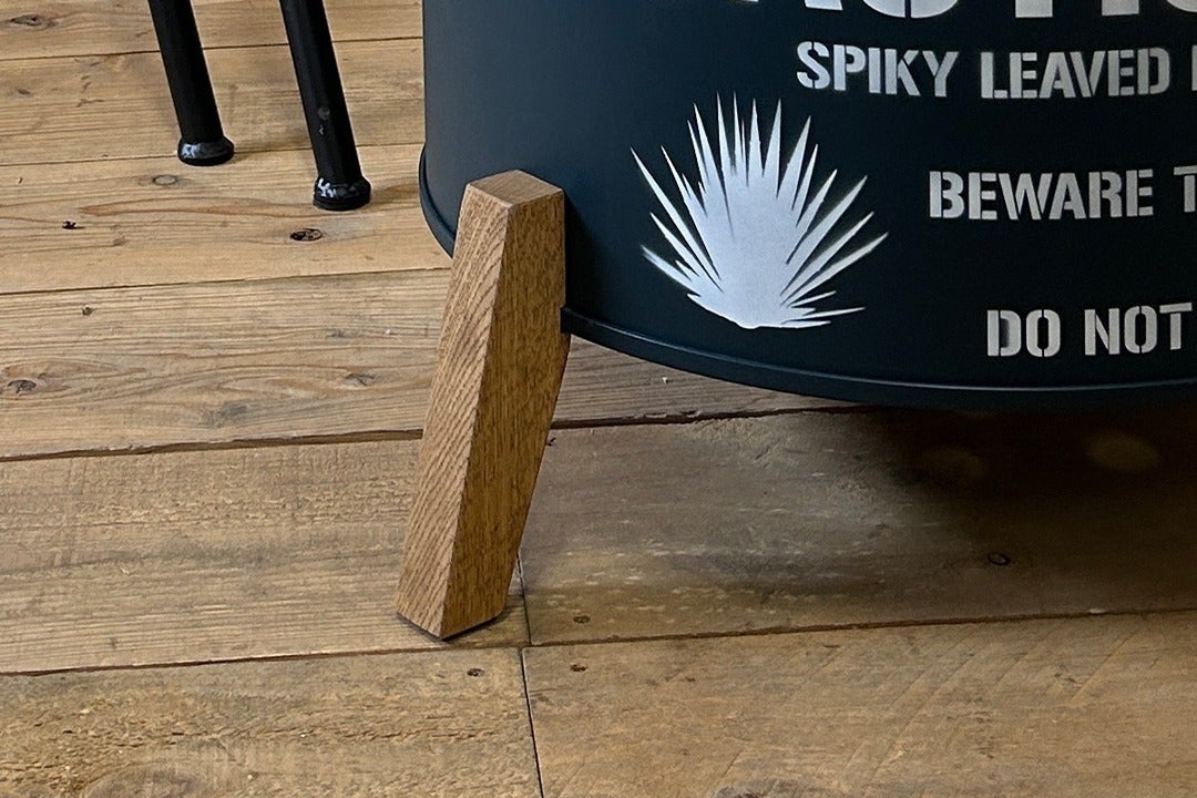 脚には、固い楢材を使用し、凹凸を付けドラム缶本体に沿うように作り、耐荷重を高めております。塗料は、高級なガラス塗料を施すことにより屋外での使用でも、長く使えるようにしております。