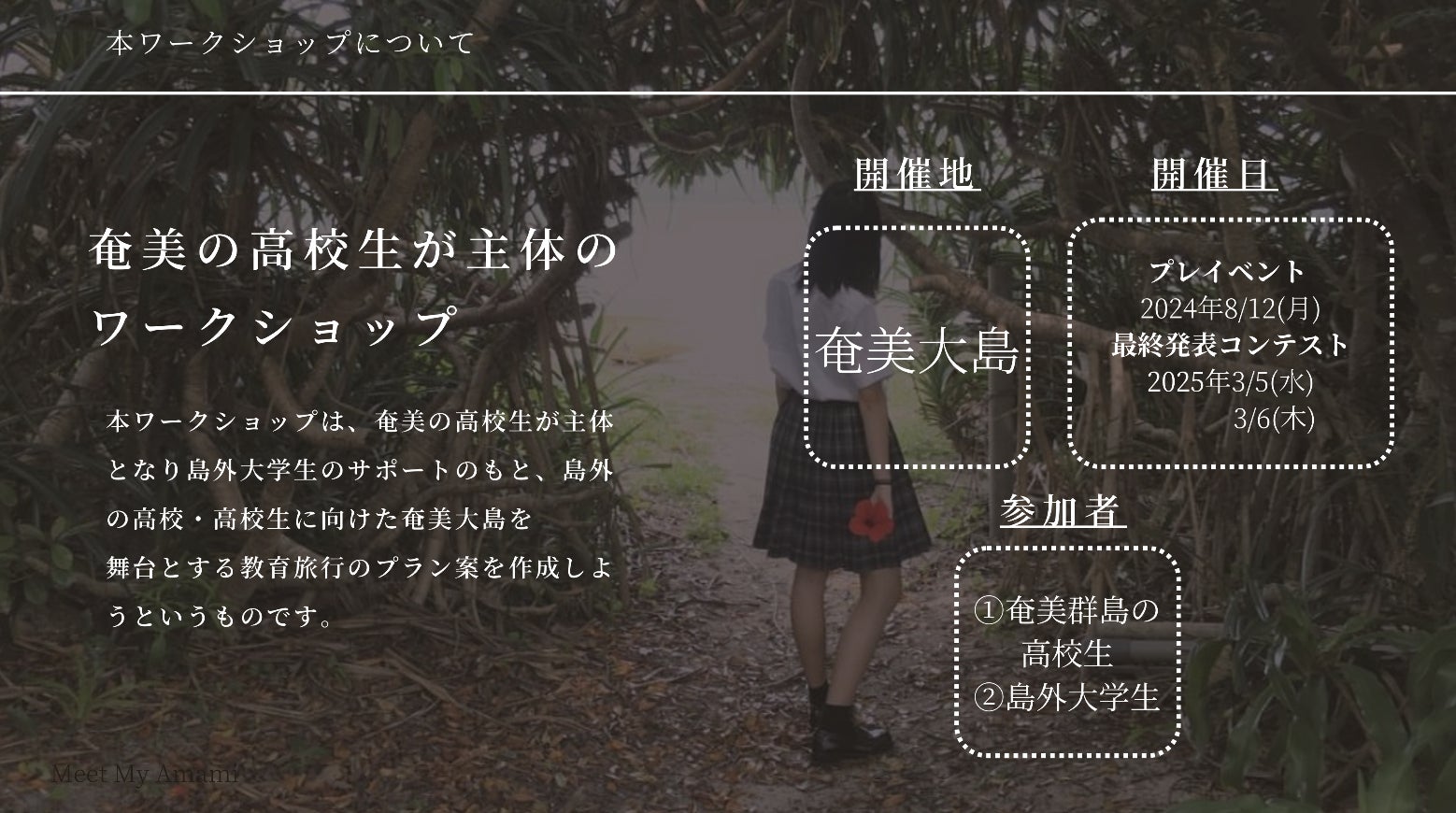 奄美大島では、地理的背景から他校の高校生や島外大学生と交流する機会が少ないのが現状です。それを課題と考えた私たちは、本ワークショップを通じて若者間の交流を促進することを目指します。そしてここで確立した奄美の次世代を担うZ世代のコミュニティは、かけがいのないものとなり将来の新しい挑戦に活用されることを望みます。
