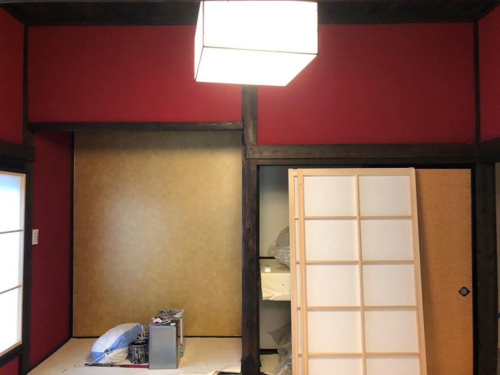 和室の一つは、遊び心を持たせ赤壁に仕上げ、派手さと繊細さを表現しました。