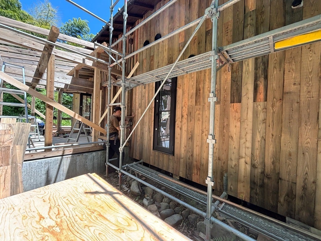 まず、建物の外観はカラマツ板の縦張りとガルバリウム鋼板張りで素材的に『昔と今』を融合させています。杉林や竹林の中にたたずむ昔ながらの古民家のイメージを損なうことなく、環境に配慮した外観デザインとしました。