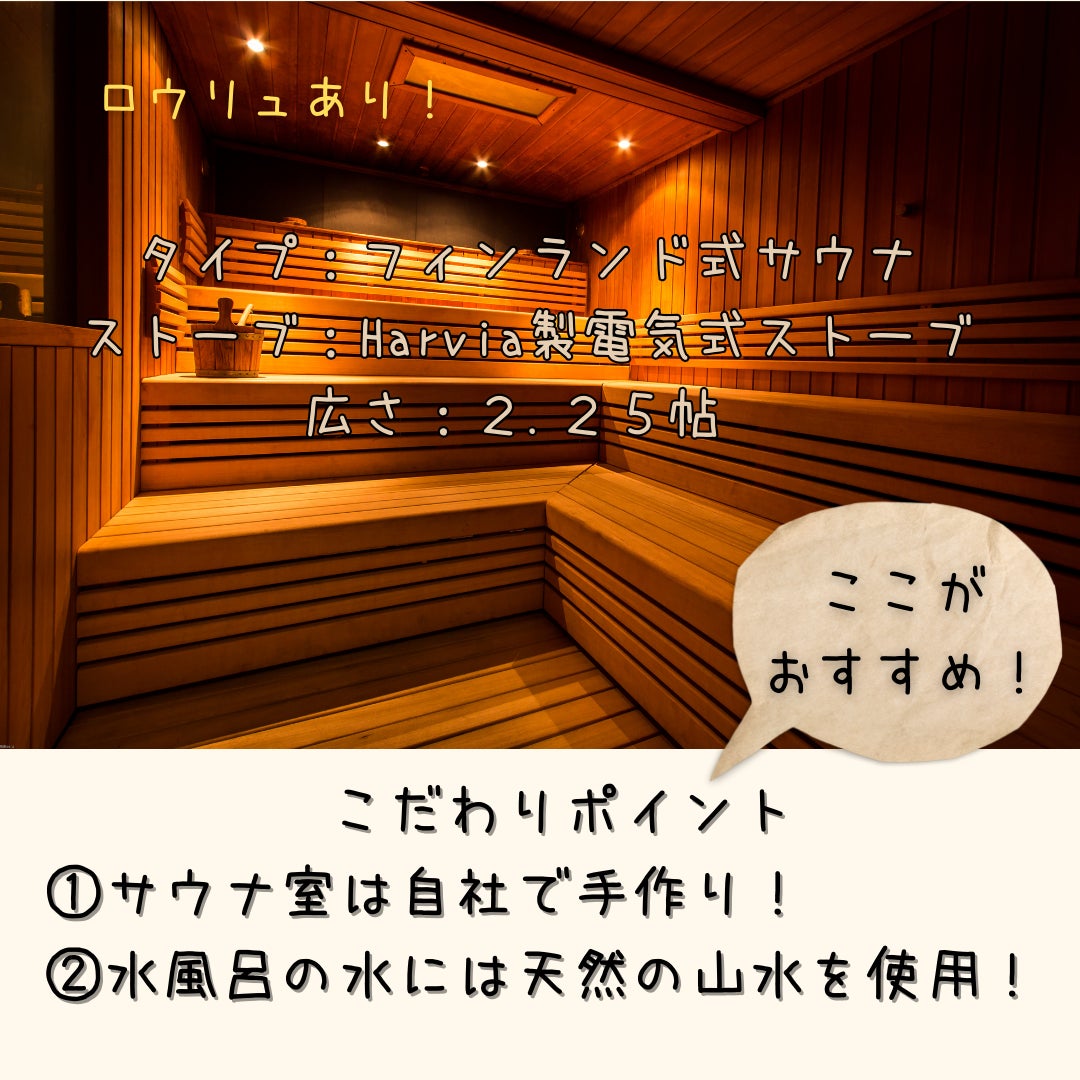 また、私たちはサウナにも強いこだわりがあります。ゲストハウス宿泊で「心からのととのいを感じてほしい」という思いで、自然と一体になれるようなプライベートサウナをご用意いたします。以下、設備の詳細です。
