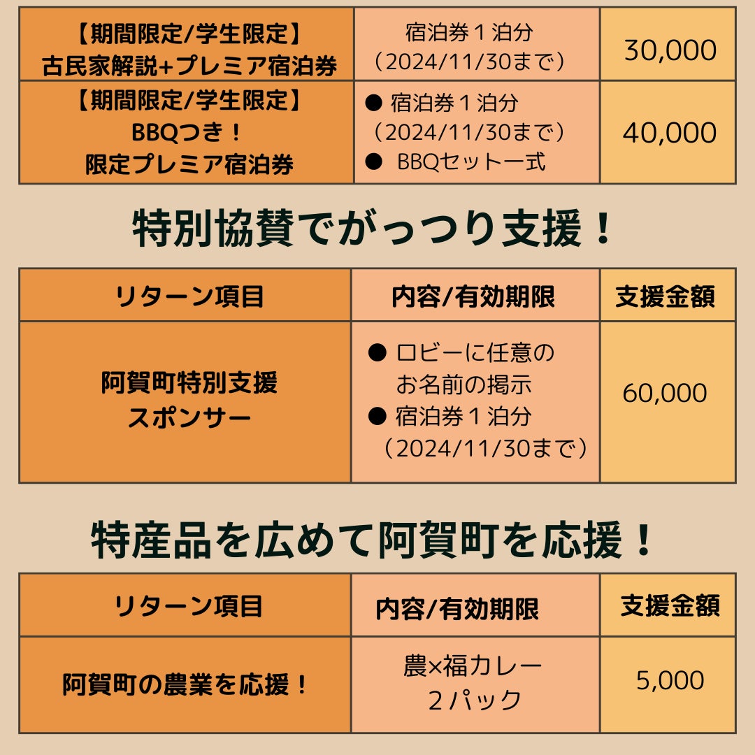たくさんの方に阿賀町に訪れるきっかけになればと思い、リターンには宿泊券をメインに様々なものをご用意しました。また阿賀町の魅力を皆さんに少しでも触れてほしいと考えた結果、支援してくださった方全員に向けて、お礼の手紙と阿賀町の観光ガイドマップをお送りさせていただきます。このプロジェクトを通して、皆様とのご縁を大切にしながら、阿賀町のことを少しでも知っていただくために、私たちから精一杯のお礼をさせて頂きます。