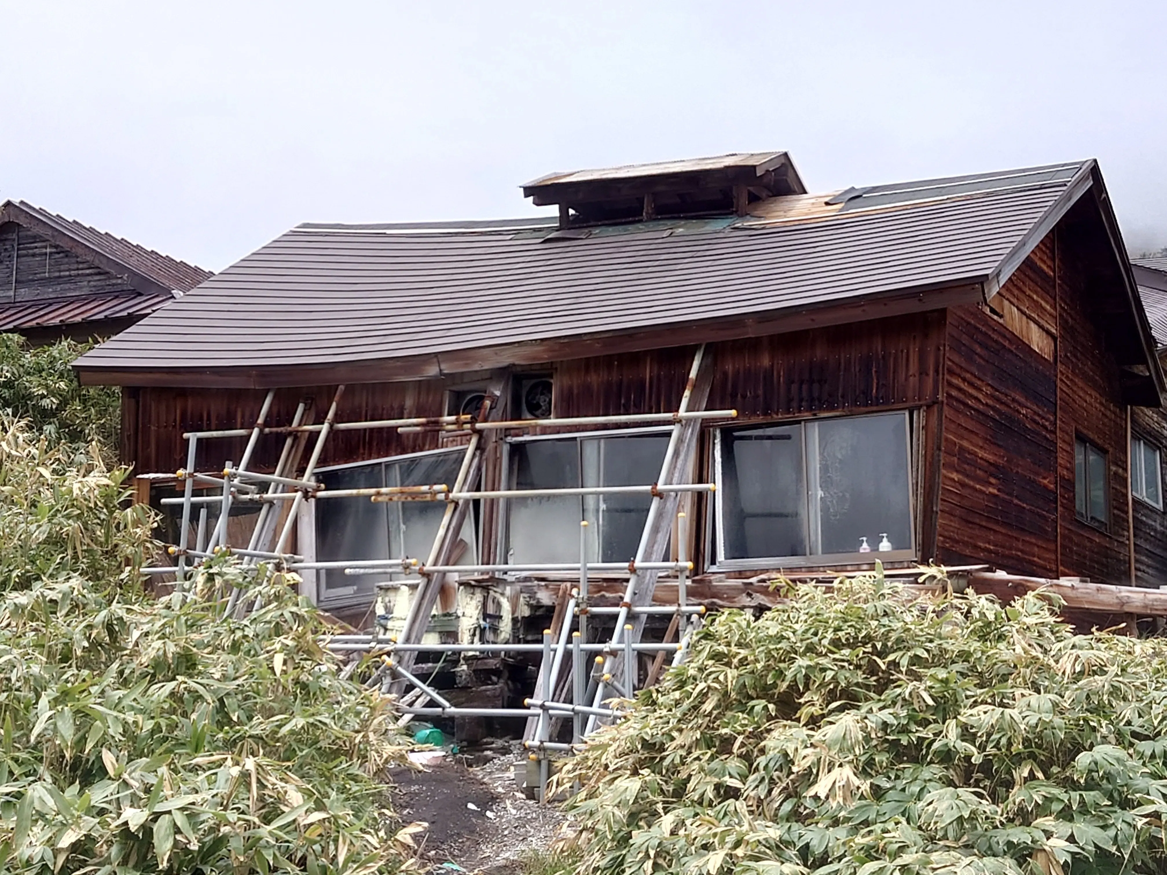サルノコシカケ湯のある浴場の湯小屋が地盤沈下により傾いてしまい、これ以上の傾きは営業の存続に係わる状況の為、地盤補強などの修繕を行い地盤沈下を止め修復を行います。また、湯小屋に併設している温泉の配管設備も一緒に歪んでおり修復予定です。