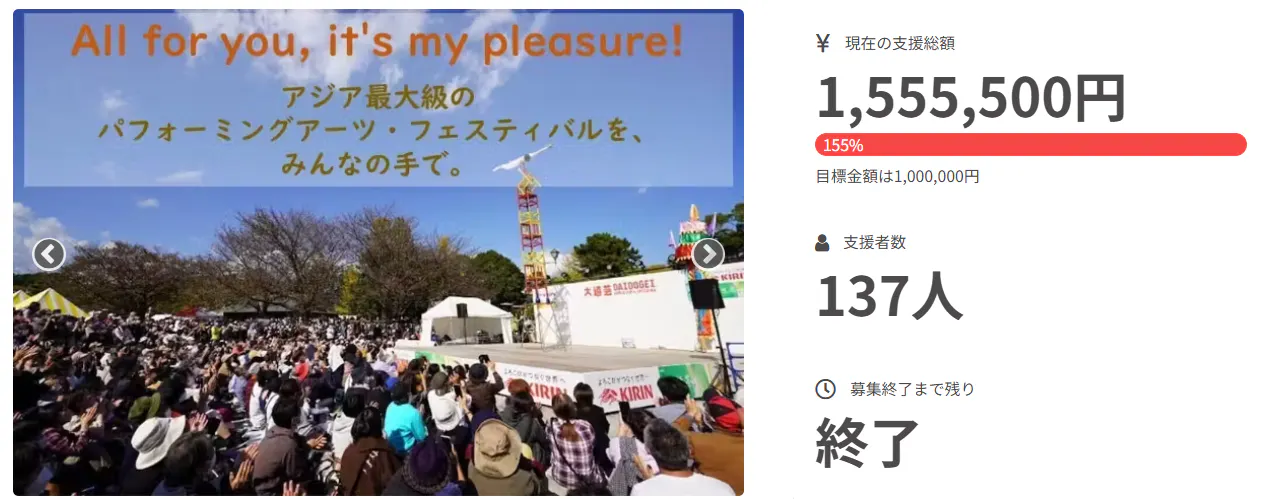 大道芸ワールドカップ実行委員会は、昨年初めてクラウドファンディングに取り組んで1,555,500円の支援をいただきました。このお金は、大道芸ワールドカップを安定的に運営していくために使わせていただいています。