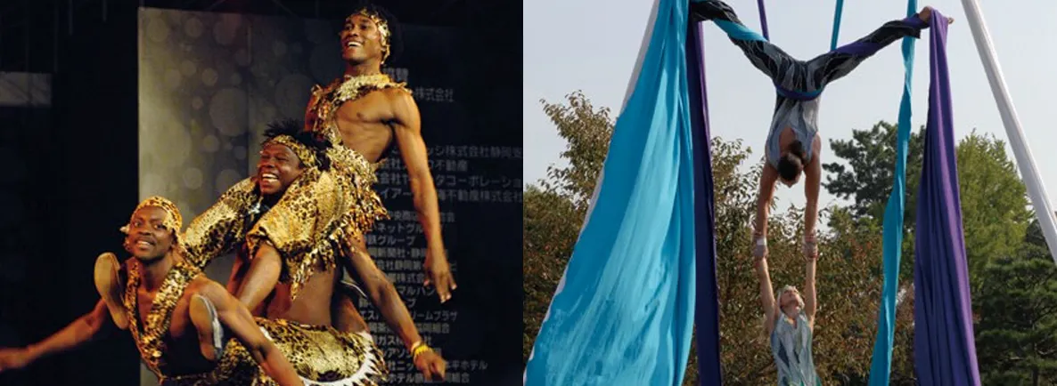 30回記念特別企画として開催されたスペクタクルショウでは、普段別々に活動しているアーティストたちが協力し合い、静岡でしか見られない、ひとつの舞台を創り上げました。