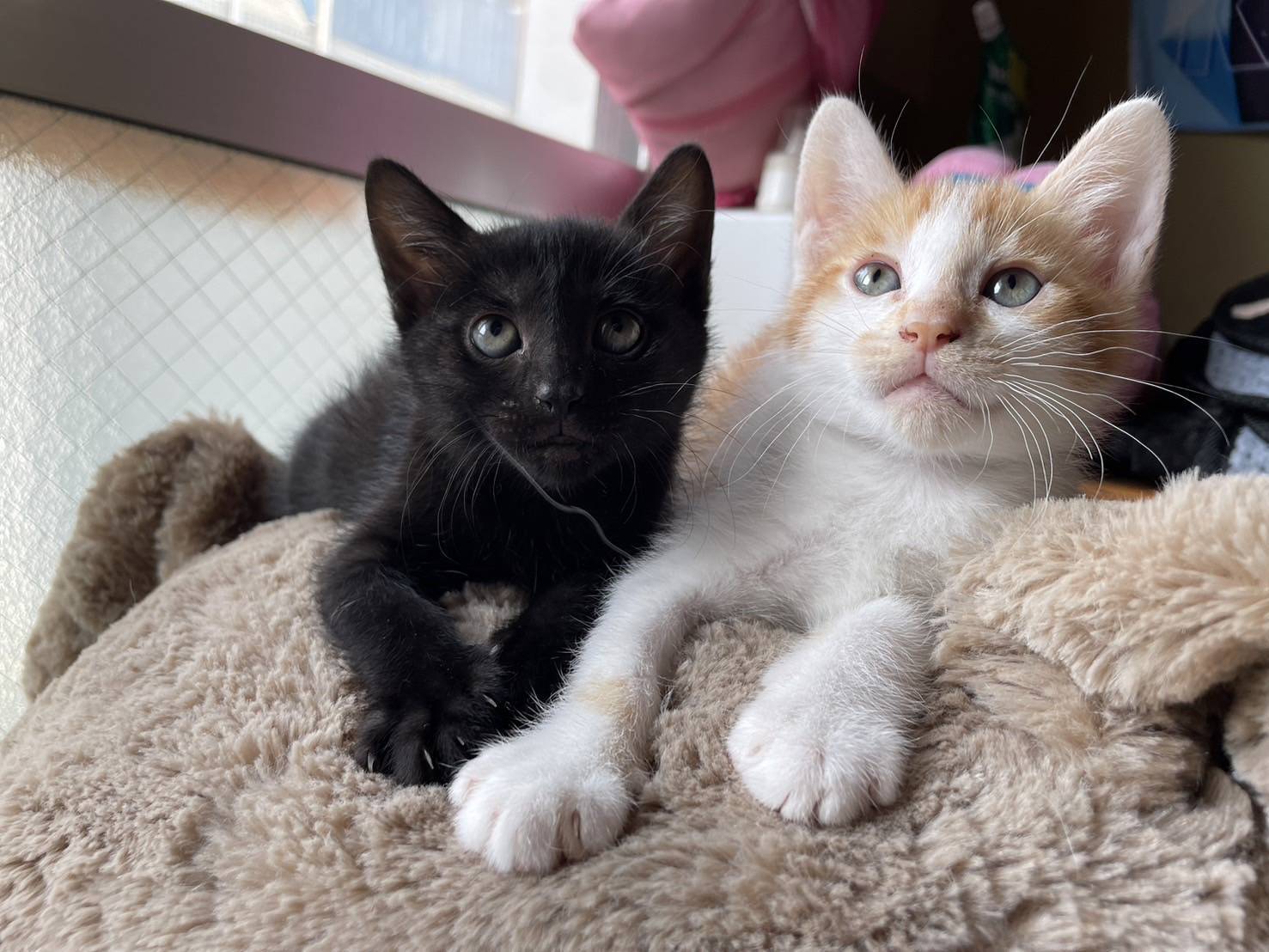 子猫達はでかいクマのぬいぐるみの頭で、寝たり遊んだりするのが今の流行りみたいですw
