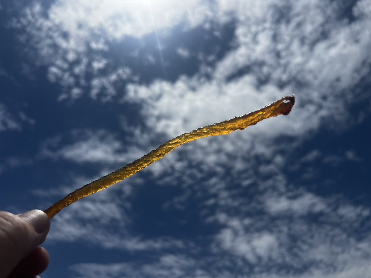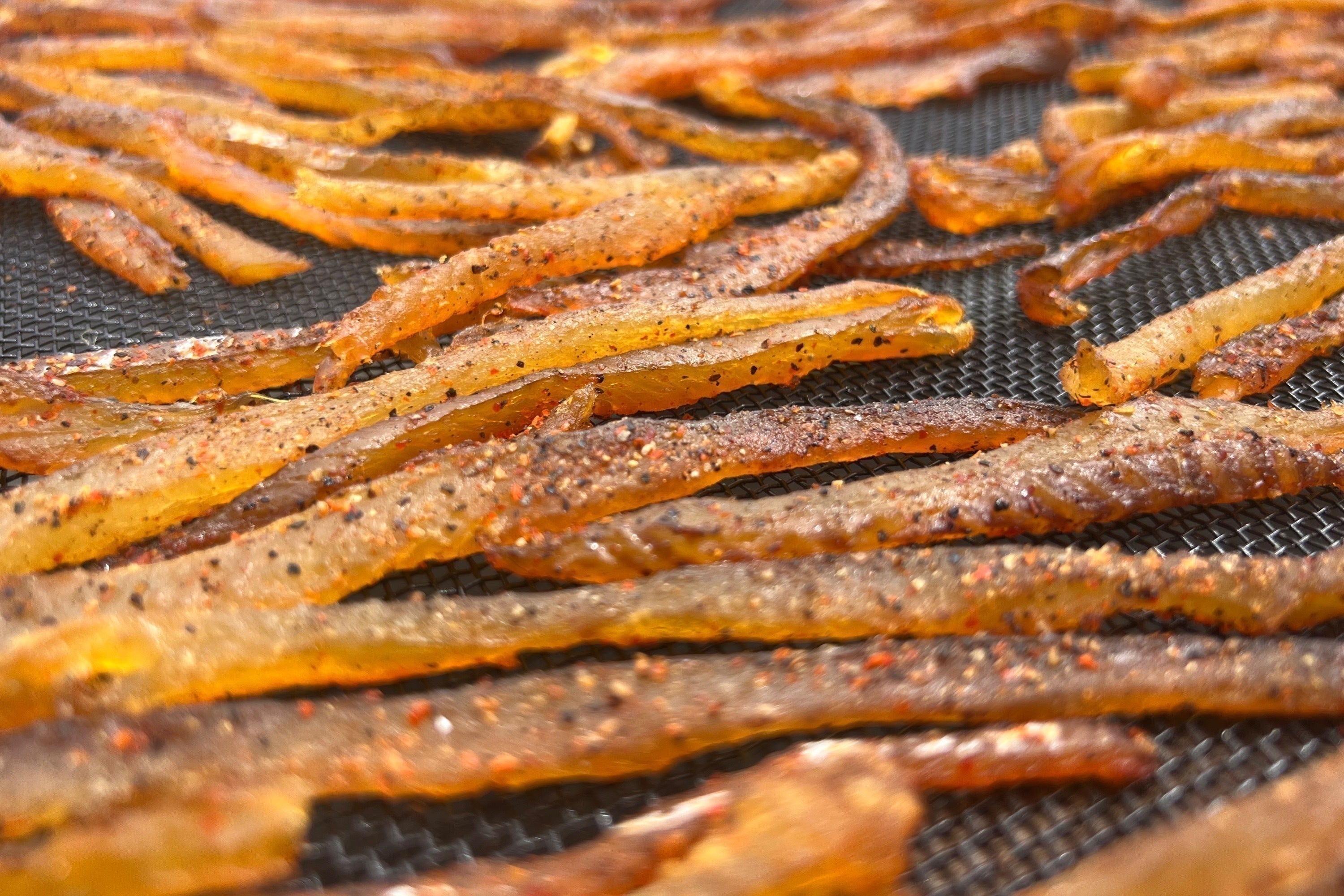 丁寧に手作業で作り上げた天然黄金なまずジャーキーの特徴は、飴色に輝くこの輝き