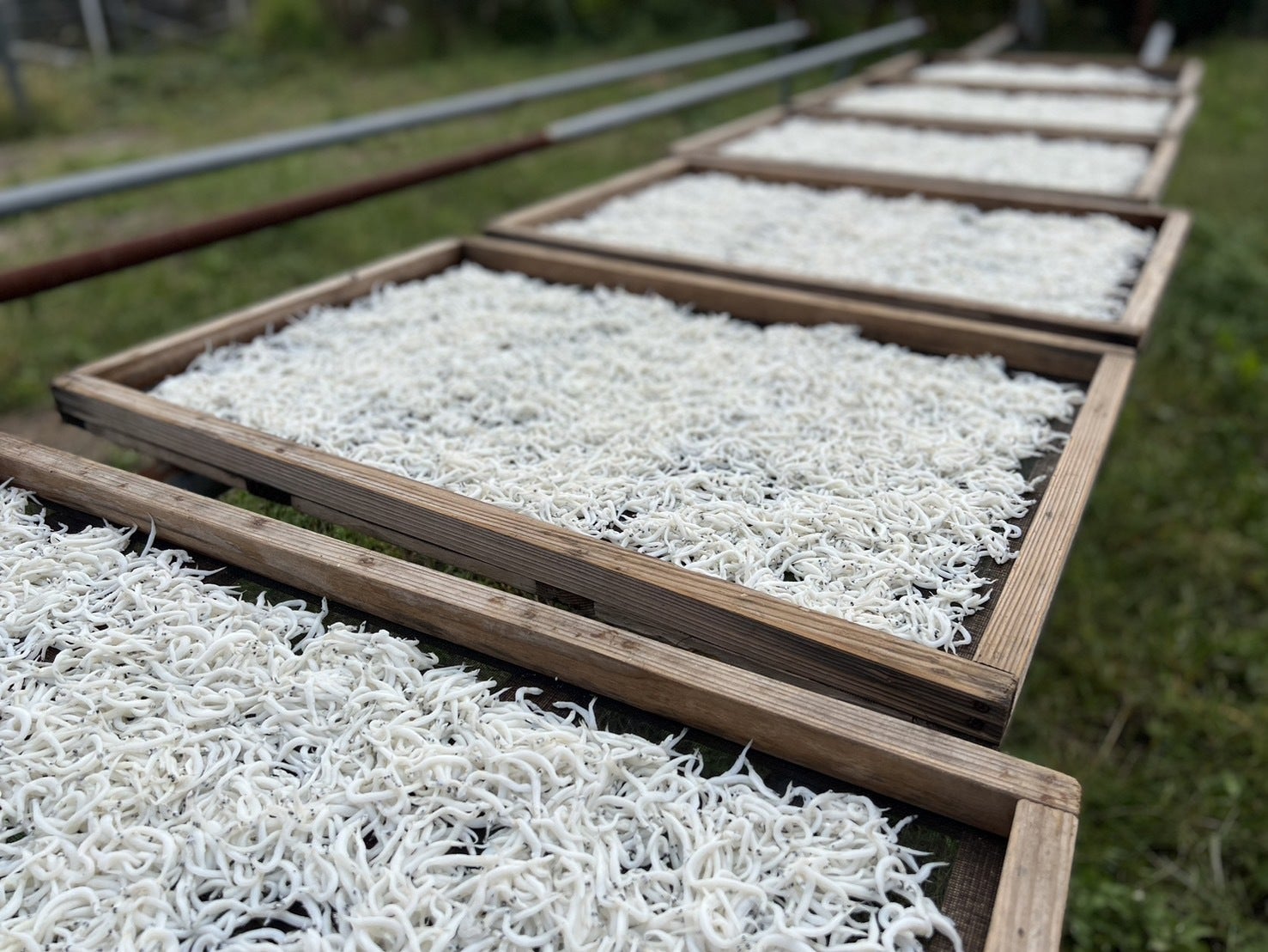 <天日干しされたシラウオ>今までは、霞ヶ浦を代表する魚というとワカサギやシラウオ、川海老、うなぎが有名でしたが、一時期ブラックバスやブルーギルなどの外来種が増えました。