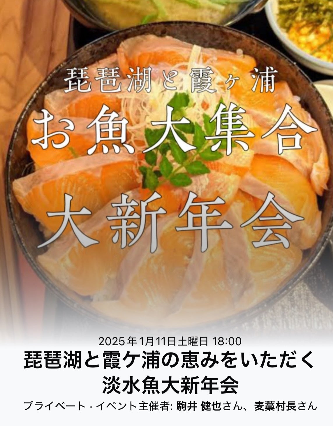 クラウドファンディング支援者各位この度、クラウドファンディング支援者様にイベント告知をさせていただきます。【琵琶湖と霞ケ浦淡水魚大集合】日本一の湖の琵琶湖と日本で二番目に大きな湖霞ヶ浦で冬の寒い時期に捕れる新鮮なお魚達を食べ尽くす新年会を開催!冬のお魚は何でも美味しい!様々な料理にてフルコースでご提供します。今回は滋賀県で開催!2025年の幕開けをお魚とお酒で乾杯しましょう!【日時】令和7年 1月11日(土曜日)18時から【場所】滋賀県近江八幡市桜宮町213-3【店名】ひさご寿し 近江八幡【会費】10000円【提供内容】琵琶湖と霞ヶ浦の魚料理(琵琶湖)ニゴイ・鮎・ワカサギ・セタシジミ・ブラックバス(霞ヶ浦)白魚・アメリカナマズ・ダントウボウ【メニュー一覧】前菜、霞ヶ浦白魚釜揚げと金時人参寄せの子宝浸し先吸物、ブラックバスと秦荘いも真薯松前昆布仕立て向付、琵琶湖まぢか油霜 霞ヶ浦白魚膾蓋物、鮎のじゅんじゅん仕立て凌ぎ、わかさぎにぎり、氷魚、あれば鰻棒寿し、琵琶湖の玉子小鍋、アメリカナマズと冬根菜大津九重白味噌仕立てラオス料理、琵琶湖まぢか香草和え(コイパー)ラオス料理、霞ヶ浦アメリカナマズのバナナの葉包み蒸し(モック・パー)揚げ物、霞ケ浦アメリカナマズ三種盛り飯物、琵琶湖と霞ヶ浦の炊き込みご飯止め椀、セタシジミ大津九重袱紗仕立て水物※漁の都合によりメニューが変更となる可能性もございます。その際はご理解いただけますようよろしくお願いします。【定員】30名参加希望の方は、メッセージいただくか、直接担当者へご連絡下さい。連絡先 090-5446-4173またお問い合わせにつきましても主催者までメッセージや連絡にて承ります。たくさんの方の参加お待ちしております。普段食べれないお魚も提供されます。また村長自体も参加をして皆さんとの交流を深めたいと考えておりますので、是非ご参加下さい。よろしくおねがいします。