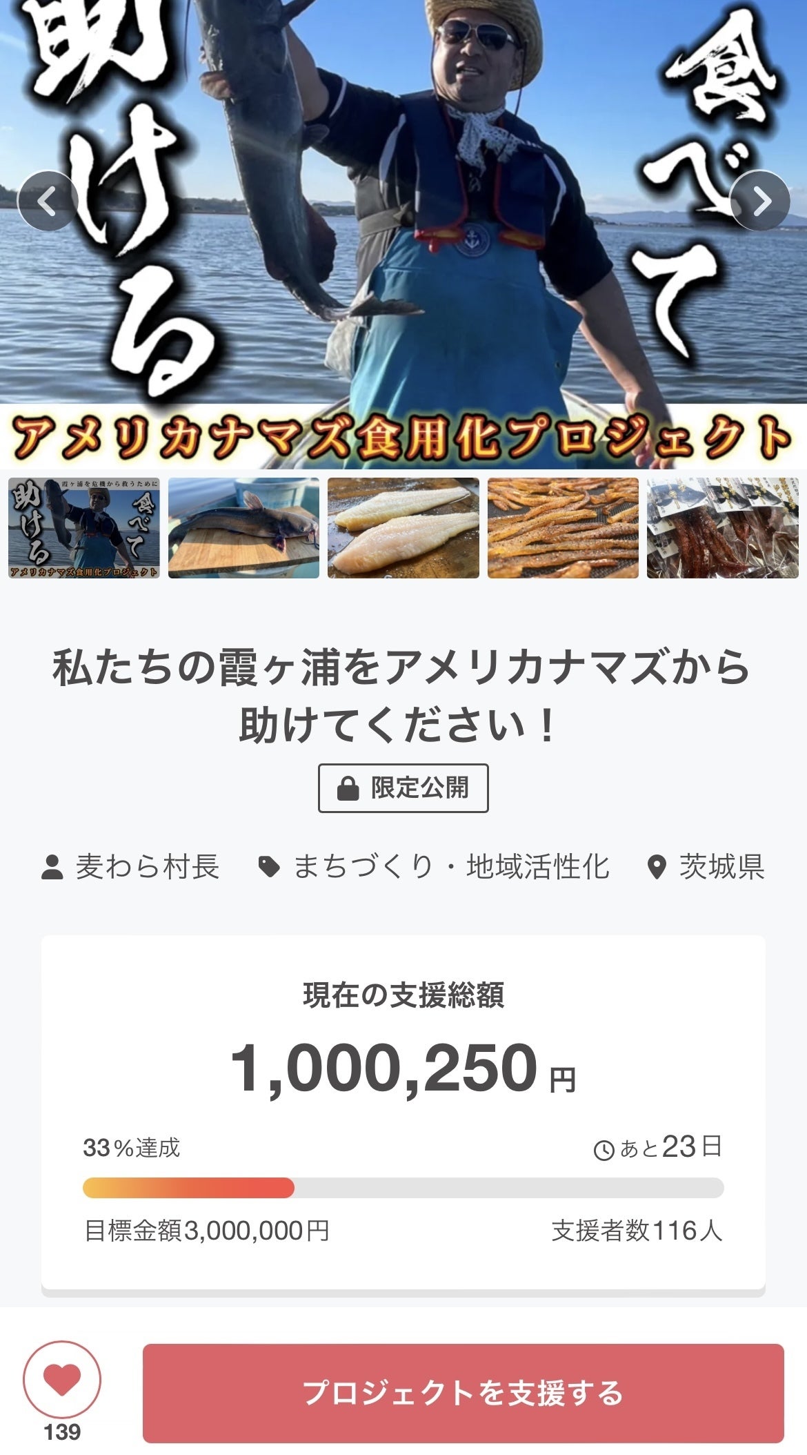 プロジェクトオーナーの麦わら村長です。皆様のご支援のおかげで現在キャンプファイヤーのトップページに掲載されてます。まちづくり、地域活性化部門は第2位になっております。これも皆様のご支援があっての事!ただ目標達成まではまだまだです。200万円を突破しましたらまた新たなリターンを追加予定ですので更なるご支援をよろしくお願い致します。最後までみんなで頑張りましょう!そして霞ヶ浦をみんなの力で助けて下さい。よろしくお願いします。