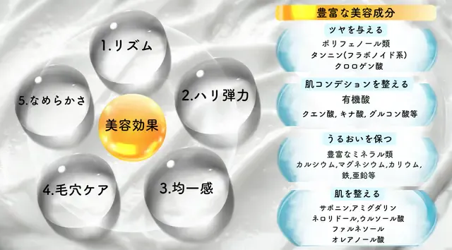 ビワの葉にはうるおい成分「クロロゲン酸」や「タンニン」などのポリフェノールや、「クエン酸やキナ酸」「サポニン」などが他の植物より多く含まれ、私のような年齢とともに乾燥などの悩みにしっかり働いてくれる成分が、実にバランスよく含まれていることが分かりました。
