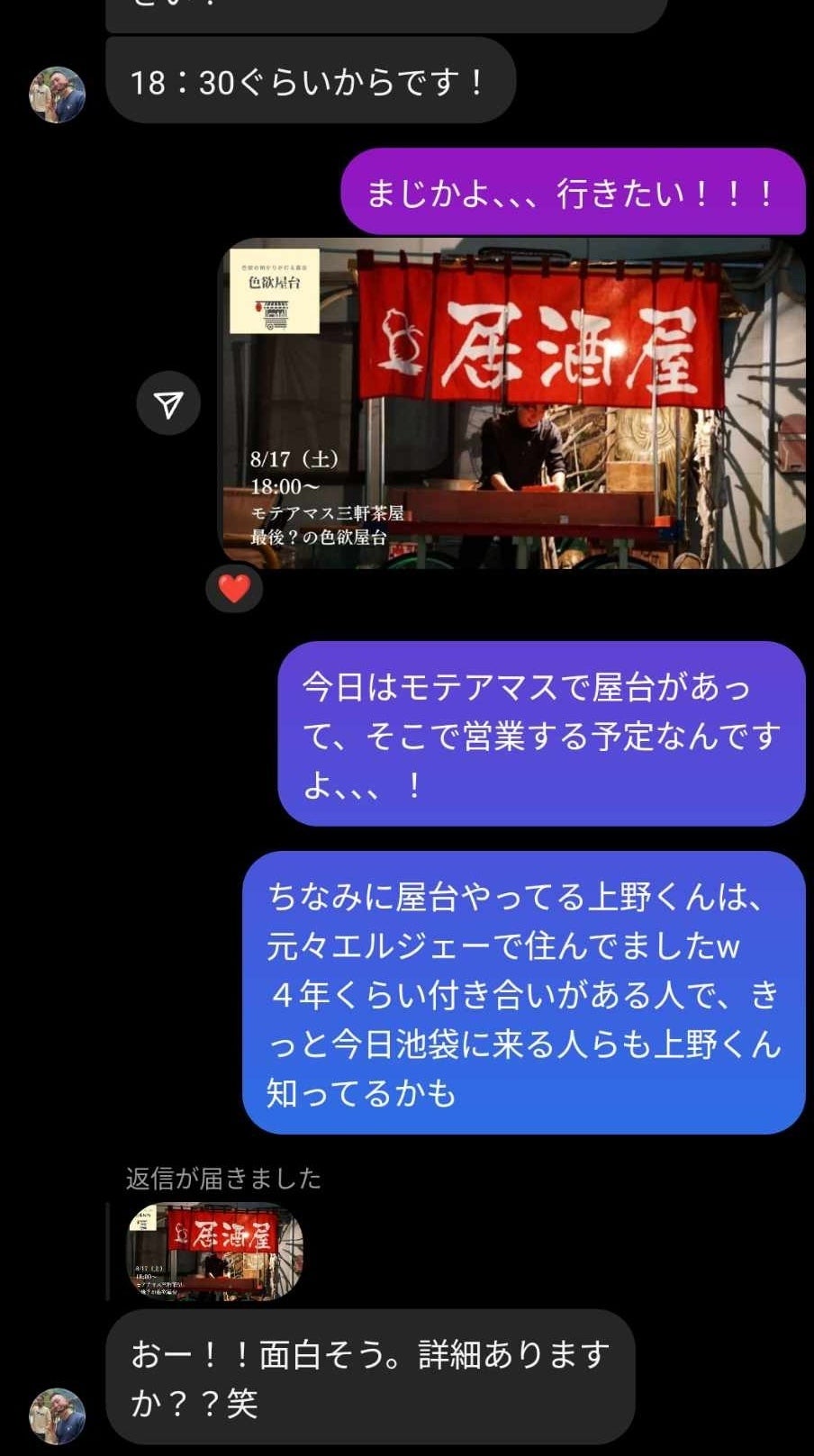 僕は屋台があるので行けないと伝えると、逆に屋台に来てくれることに。