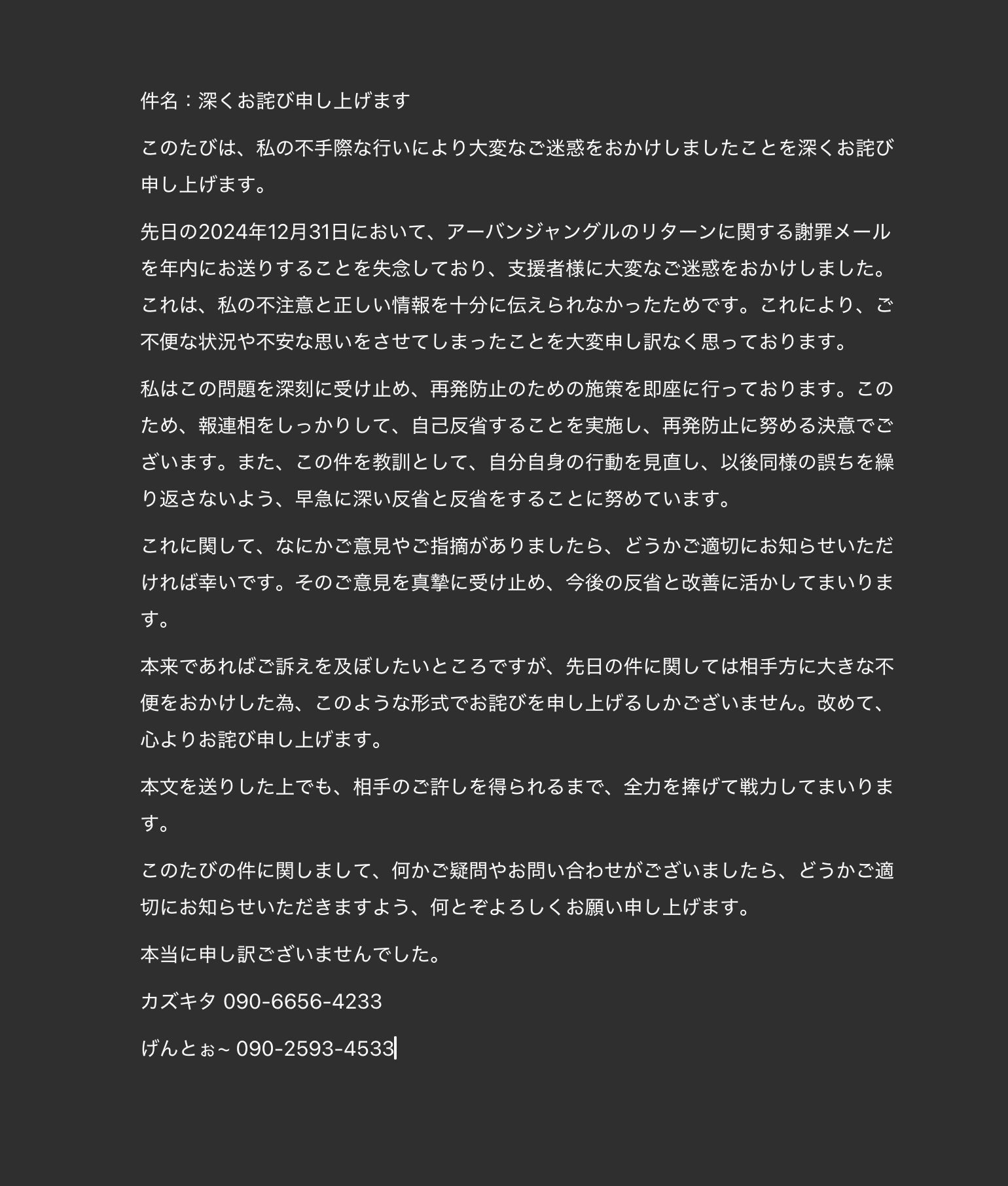 謝罪メールリターンを送るのを忘れていたので、忘れていたことを謝罪するメールを支援者様にお送りしました。このたびは本当に申し訳ございませんでした。