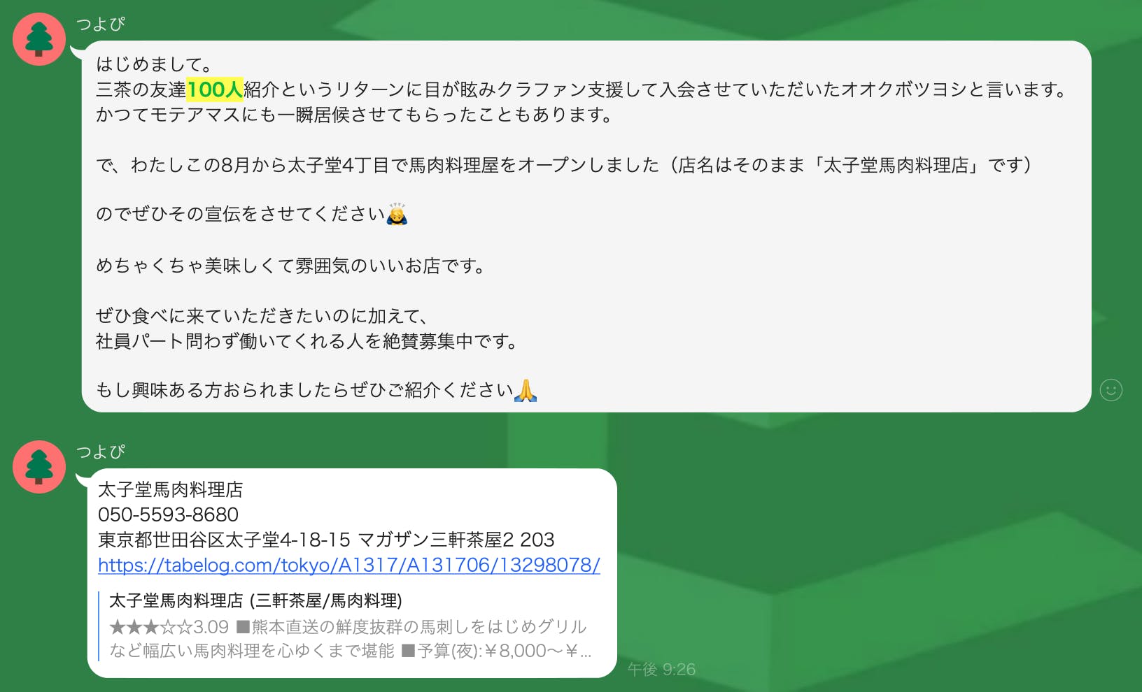 アバジャン尊師カズキタです。大変遅くなりましたが、三茶の友達100人紹介するリターンを実施しました!!具体的には、モテアソブが運営している【三茶に住んでいる】120人が所属するオープンチャット、ファッション住民へ加入とさせていただきました。こちらから、ビジネスへのリードなどが大量に獲得できると思います!支援いただきありがとうございました!!!
