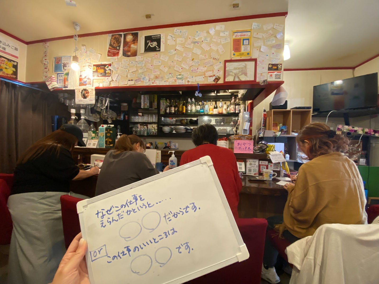 毎週木曜の午後1時から5時まで、イベントバーリコードという東村山駅からほど近いバーを間借りして昼スナックをやっています。スナックって不思議で、なんの利害関係もないママになら安心して話せちゃう。あとカフェやバーと違ってお隣さんとお話することも自然にできちゃう。私もすっかり自然体で楽にやっているので、お店というよりもうひとつのリビング、みんなの居場所って感じですね。