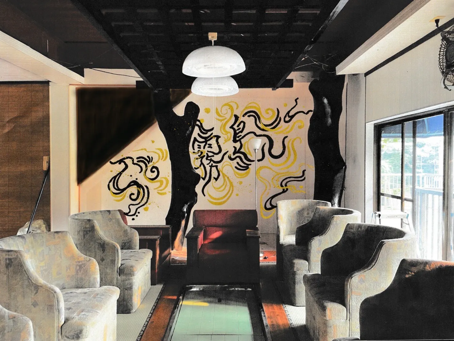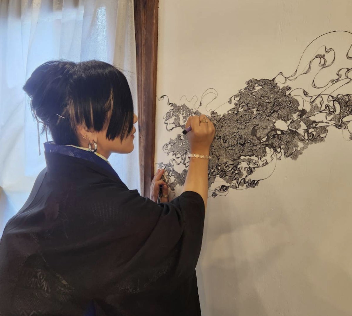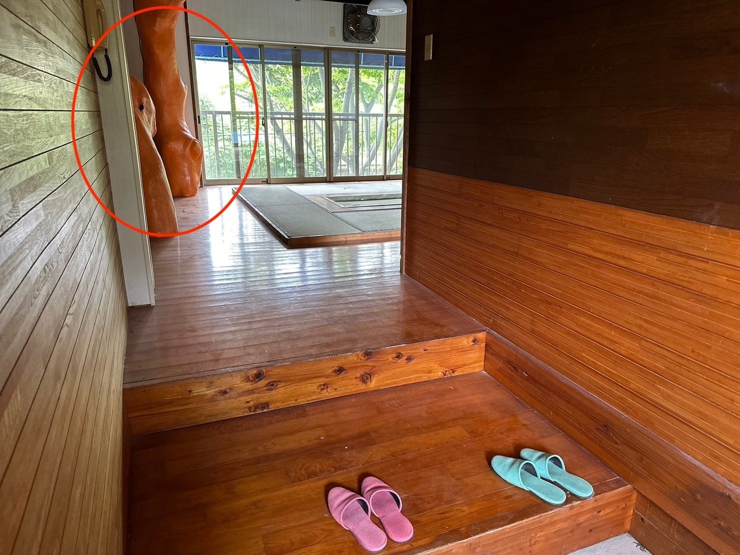 現在部屋の中に不思議なオレンジの柱があります。ちょっと気持ち悪いです。この不思議な柱に和テイストを盛り込んだペイントを施し来館されるお客様への思い出の1ページになるような写真が取れれば素敵だと考えていました。。そこで和のペイントを得意とするアーティストをこの地域で探していて見つけました。室内に来館記念になるフォトスポットを作る予定です。