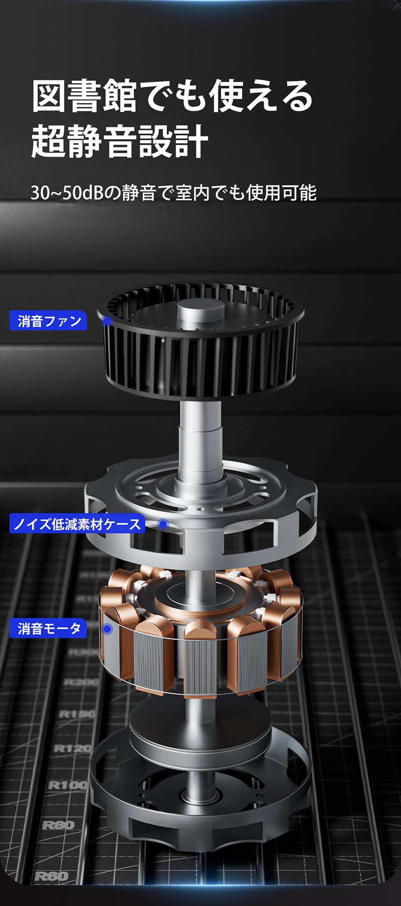 ダクト消音技術を採用しており、使用時の動作音は30~50dBと静かなため、屋内での作業でもご使用いただけます。