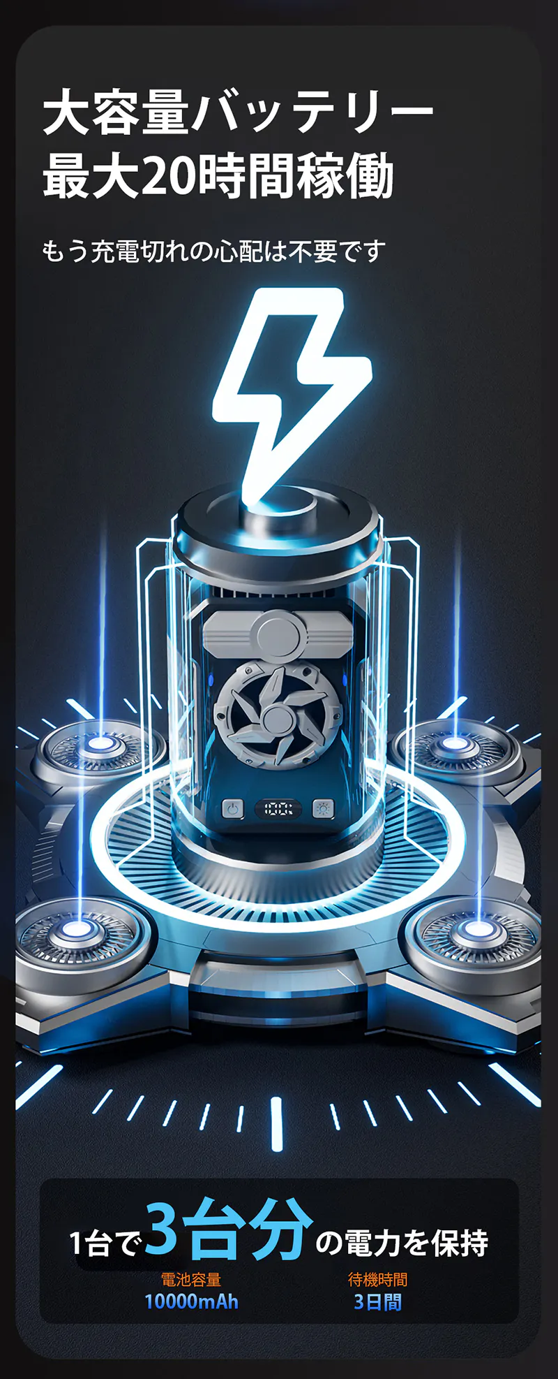 10,000mAhの大容量バッテリーを搭載しており、1回の充電で最大20時間連続使用できます。