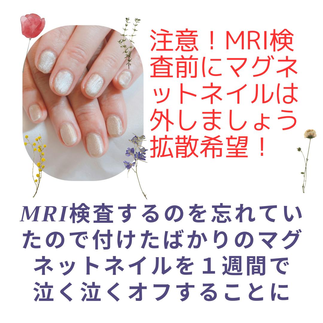 2025/02/12 21:05拡散希望!注意!こちらのお客様はMRI検査をする前に気がついてよかったですよね。!でも付けたばかりのマグネットネイルを1週間でオフすることに!もう泣きたいですよね。!女性の方はMRI検査をする前にマグネットネイルしていたら、必ずネイルサロンでオフして下さいね! もっと見る