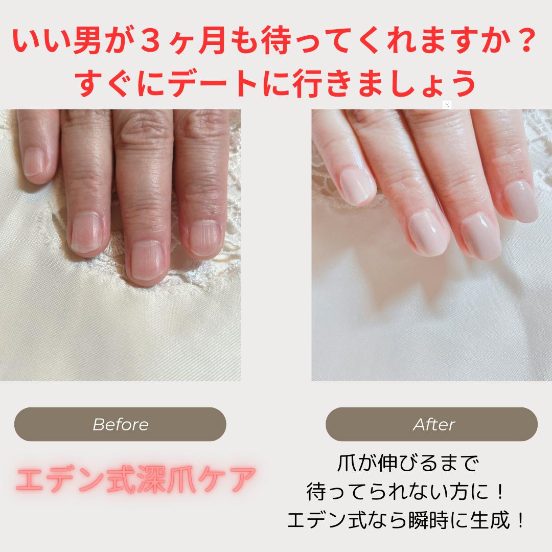 2025/01/29 14:17【エデン式深爪ケアで、憧れの美爪を手に入れませんか?】「深爪で悩んでいるけど、なかなか治らない…」そんなあなたにこそ、ぜひ体験していただきたいのが、エデン式深爪ケアです。巷の深爪ケアは、爪を伸ばすためのウェットケアが中心でした。しかし、エデン式は違います。アクリルのスカルプチュアを使用することで、短期間で、横長の深爪を美しい縦長の爪に変身させることができます。エデン式深爪ケアの3つの魅力・即効性: ウェットケアのように何ヶ月も待つ必要はありません。エデン式なら、たった3ヶ月で理想の爪に近づけます。・確実性: アクリルの強度で爪を保護するため、深爪でお悩みの方でも安心して施術を受けることができます。爪を噛む癖がある方にもおすすめです。美しい仕上がり: 縦長で美しい爪は、指先をすらりと見せ、見た目の印象を大きく変えます。・ネイルアートも楽しめます。 もっと見る