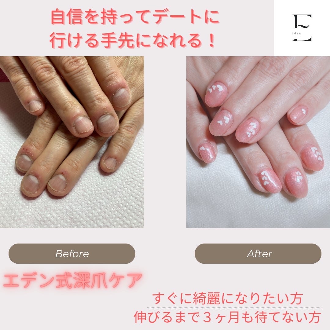 ホットペッパービューティに約10年ぶりに出すのでまずは自己紹介からです。横浜で最初に深爪矯正専門店を始めたのが弊社のNAIL EDEN SALON深爪矯正専門店です。ネイリスト歴23年のベテランネイリストです。(おばちゃんと呼んだら怒ります)法人化して20年になります。この10年間ぐらいはなぜホットペッパービューティに出していたかったのかと言いますと、ご紹介で回っていたからです。ですが、新しい客層も呼び込んでみようということになり、10年ぶりぐらいに広告を出してみることにしました。【エデン式深爪ケア】は私が考案したオリジナルの技法です。最近ではただウエットケアするだけで3ヶ月ぐらいで伸びますよというところもありますが、エデン式ですとアクリルのスカルプチュアを用いますので、すぐ指先まで綺麗に長さが出るので、3ヶ月待つ必要はありません。そして一番大切なのは折れにくいお爪の形に矯正ができることです。サロンに通わなくなったらまた折れたでは話にならないですよね。超重症度の深爪さんもお受け入れ可能な技術です。いじり癖がひどい方は上から硬いものを被せていないと絶対に治らないですよね。3ミリの重傷の深爪も美爪にすボスことができる魔法をかけてあげられます。魔法にかかりたい人はご予約してくださいね。