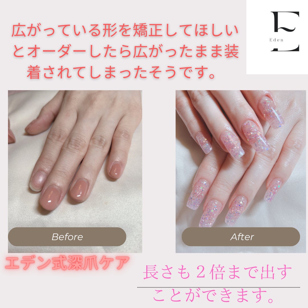 広がってぺったんこな形を直したいと、他店様にオーダーされたらアクリルスカルプチュアなのに広がったままつけられてしまったそうです。(悲)そして長さも出してもらえなかったそうです。(泣)エデン式深爪ケアでは自爪の2倍まで長さを出すことができいますよ。もちろん幅寄せをして強度を出すためにスカルプチュアは必要不可欠だと考えます!