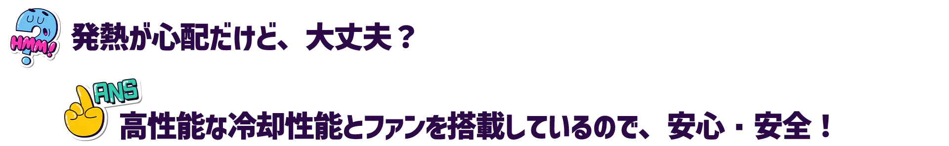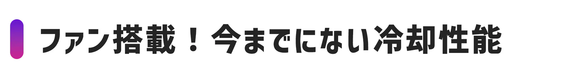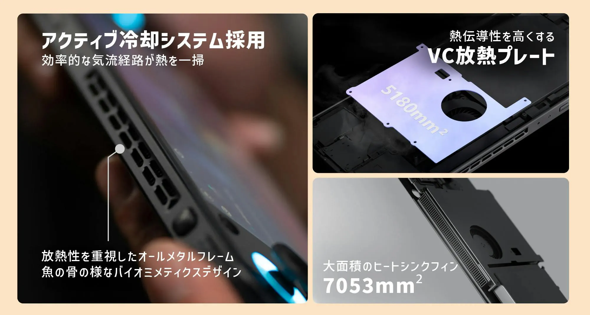 スリムなボディに5180mm²の巨大なVC*放熱プレートと冷却ファンを搭載。総ヒートシンクフィンの面積は7053m㎡ と大きく、広範囲の熱伝導性が向上し、背面が熱くならずに長時間の使用可能です。