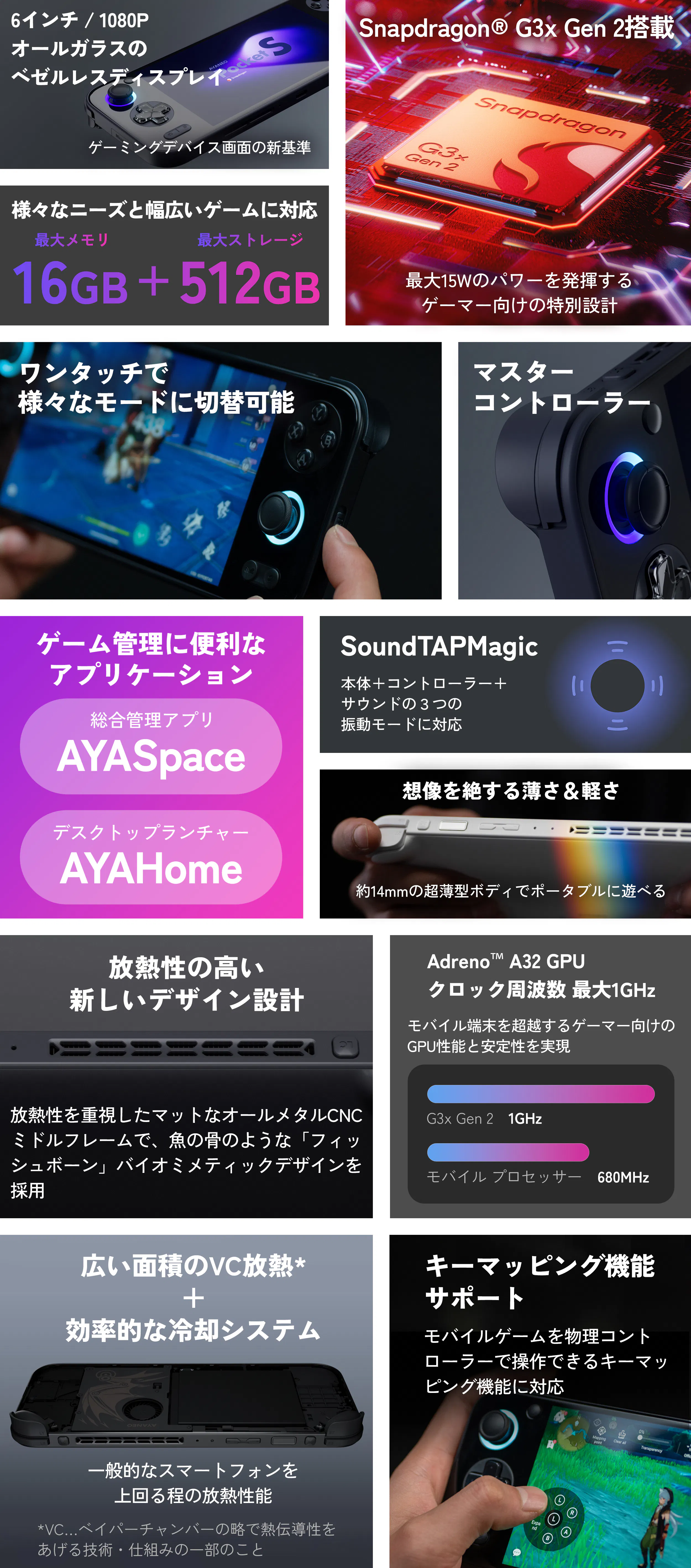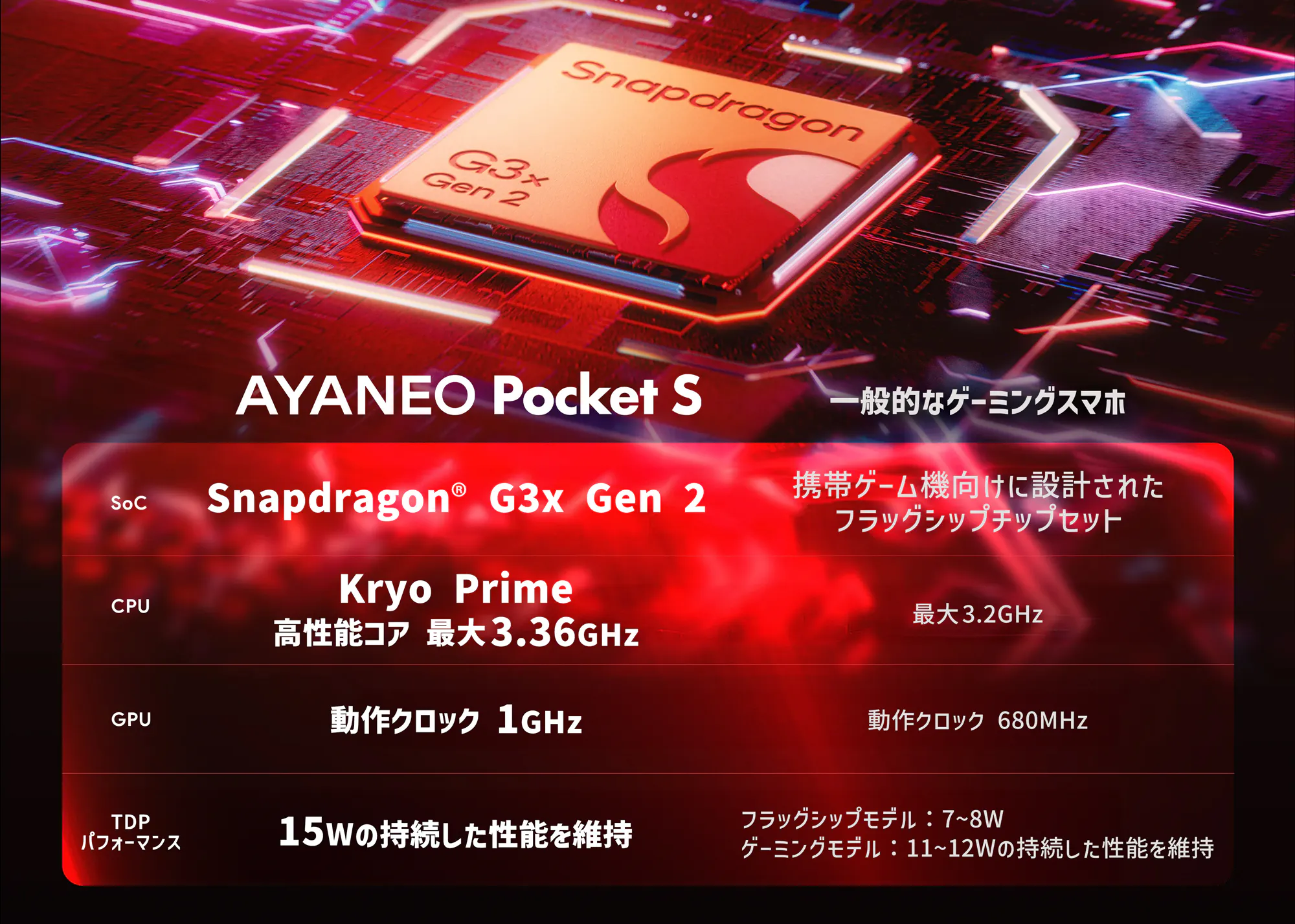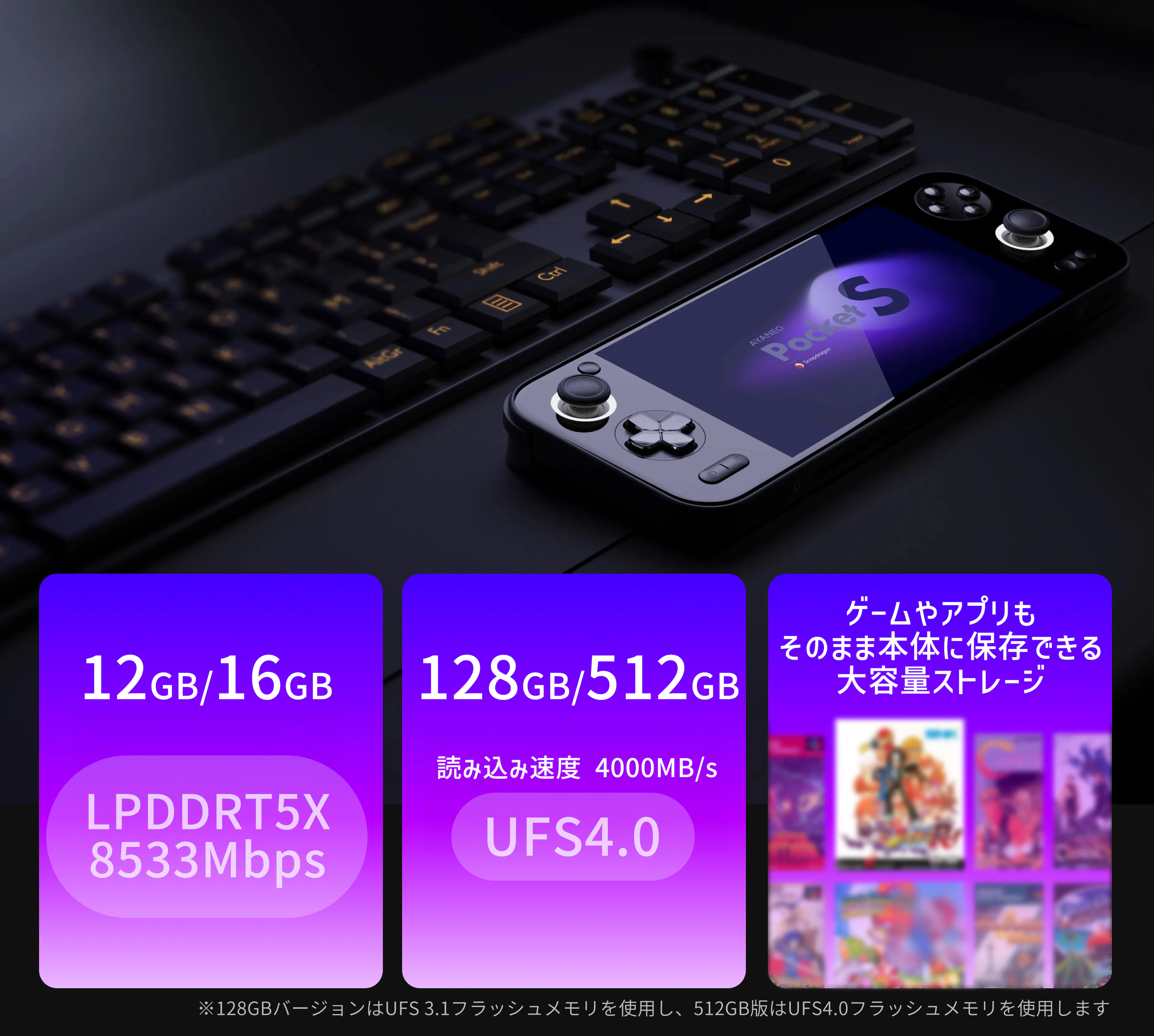 最新のゲーミングスマートフォンで採用されている‘Snapdragon 8 Gen2’をゲーム用にカスタマイズした「Snapdragon® G3x Gen2」のSoC(System on a Chip)を採用。AYANEO Pocket Sは、このSoCが搭載された初めてのポータブルゲーミングデバイスになります。さらにスマートフォンとは思えない大容量メモリを搭載!幻塔などの大作ゲームも最高性能で遊ぶことができます。