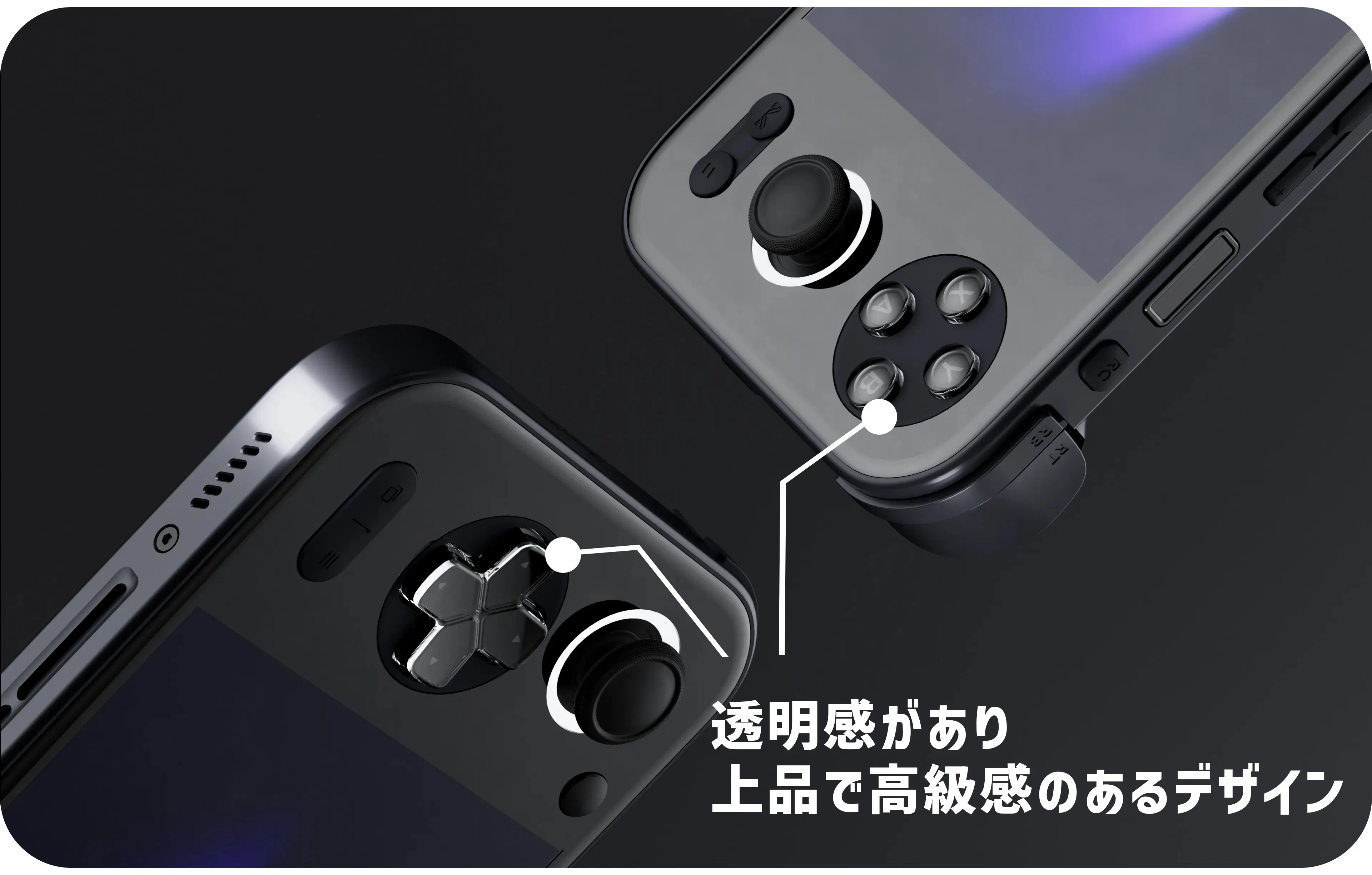 高強度のCNC加工のボディとマットな質感を出すサンドブラスト加工が施された背面は持ち心地が良く、快適な持ちやすさを実現しました。さらに十字キーとABXYボタンは透明感のあるデザインを採用。オールフロントガラスのディスプレイと相まって上品さと高級感を両立した逸品です。