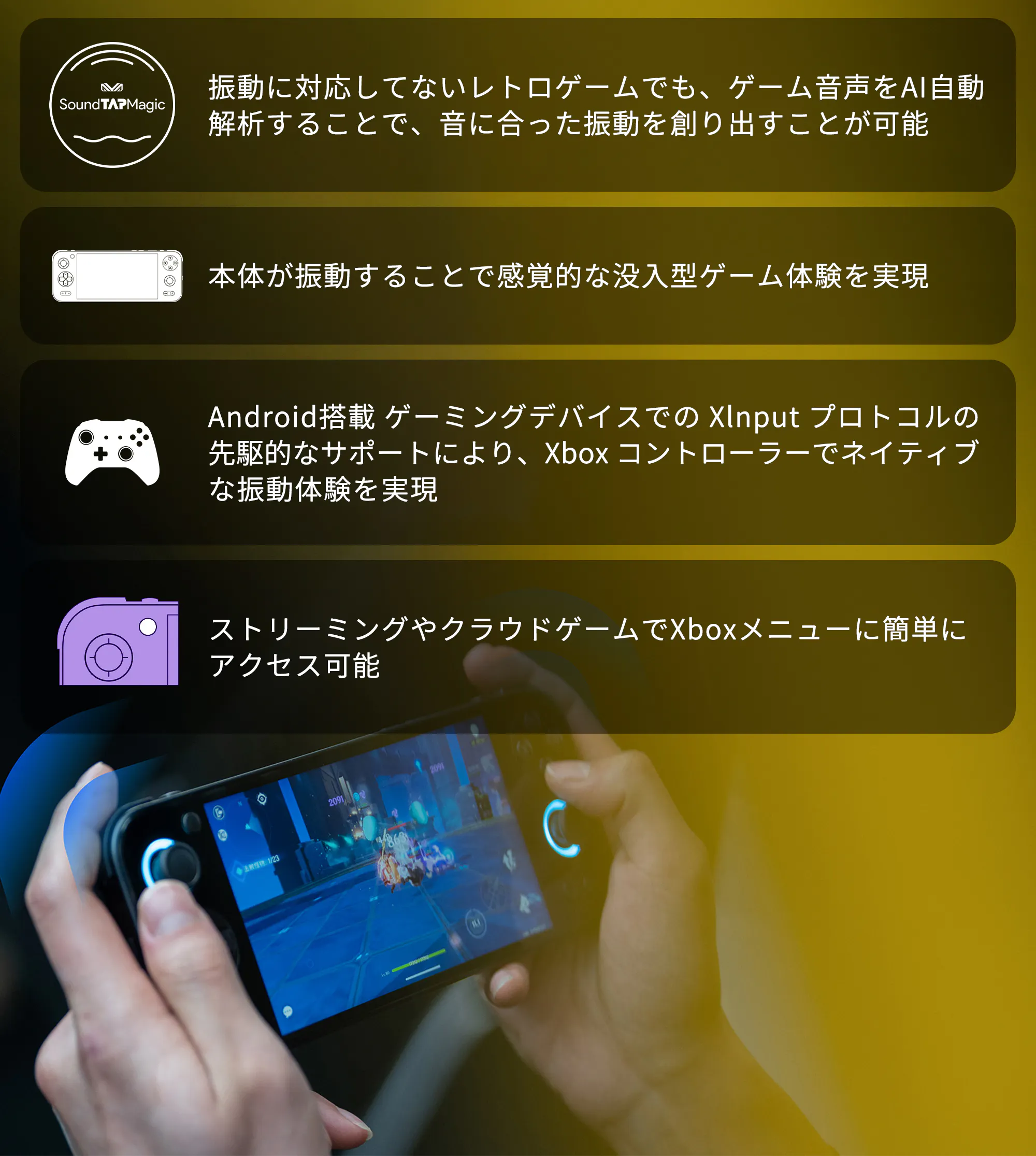 ・Google Play、App Store、Xbox クラウドゲーミング(GamePass)、Steam Link、GeForce NOWなど、数千本のクラウドゲームに対応