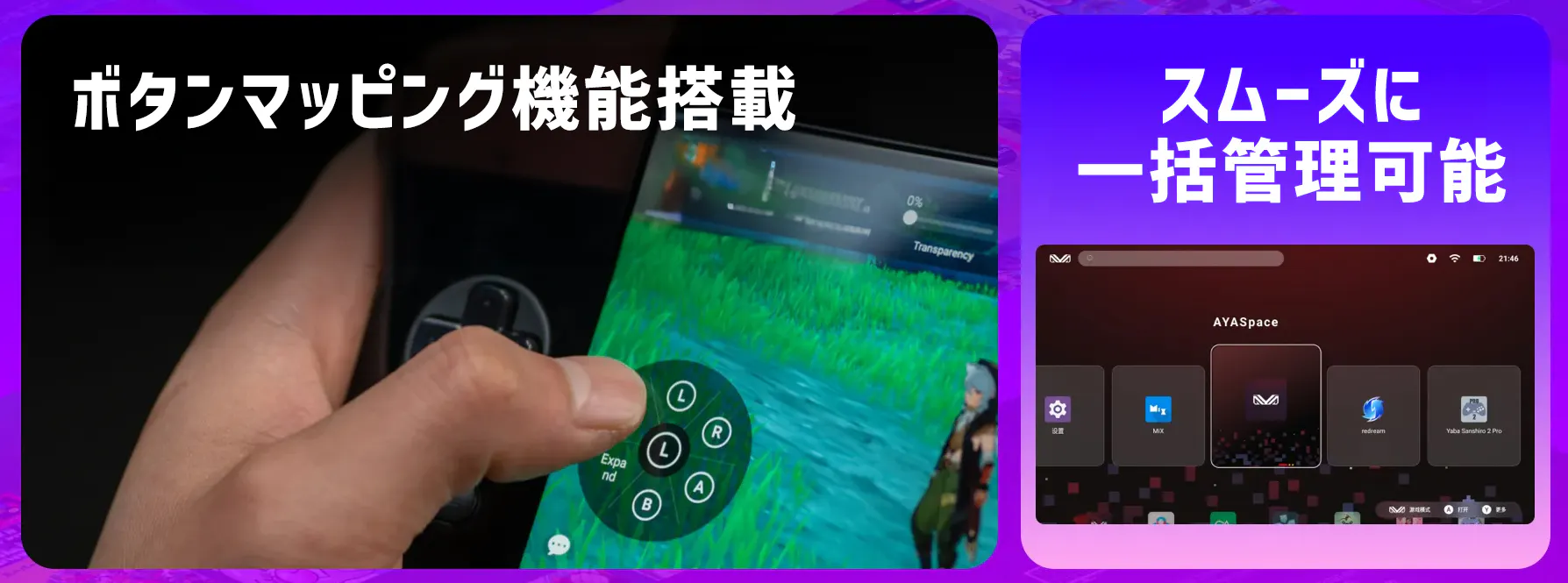 ゲームパッドコントロールをモバイルゲームに適応させるボタンマッピング機能を搭載。コントローラーに対応していないゲームでもボタンの割り当てをすれば、コントローラーでの操作が可能。ボタンの透過や設定はAYASpaceの機能で簡単に設定できます。異なる設定をゲーム別に保存してくれるので、1回設定すれば再度設定することはありません。
