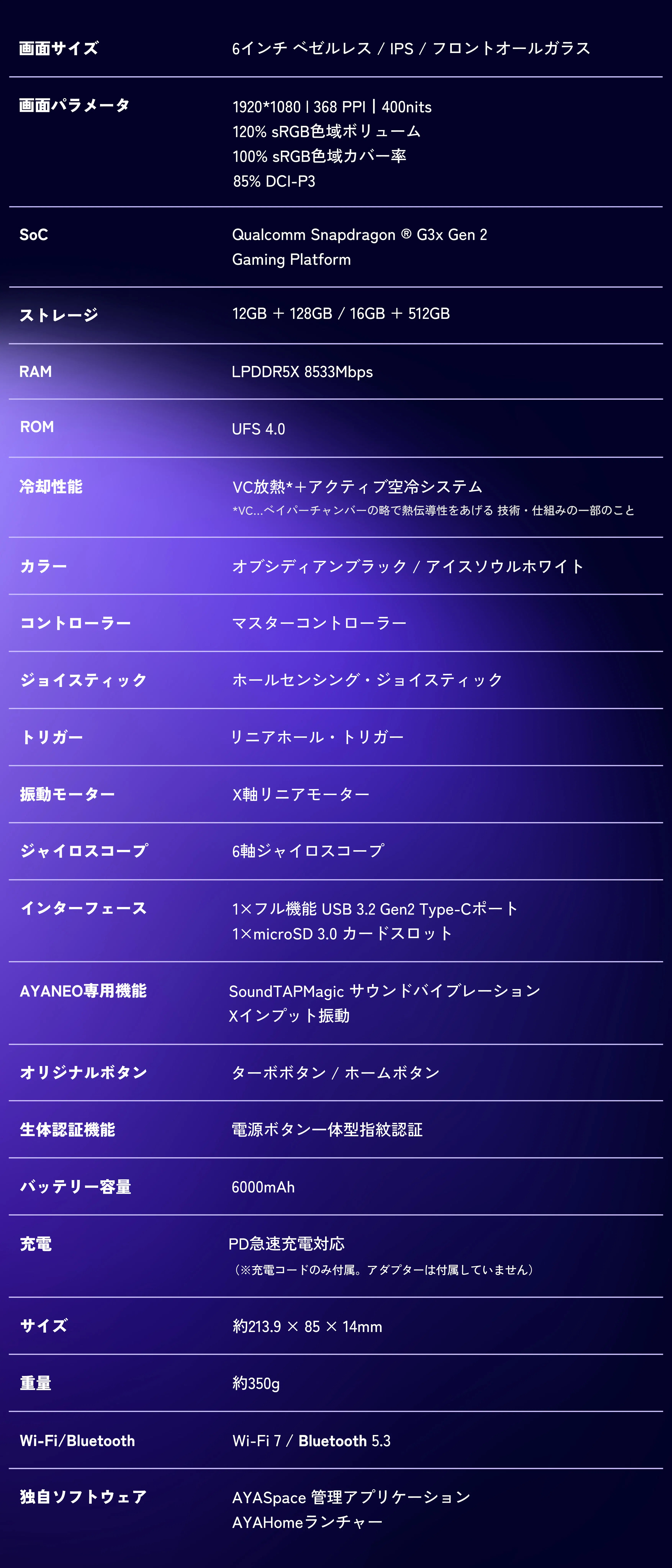 AYANEO初のWi-Fi 7とBluetooth 5.3 をサポート。スループット性能はWi-Fi 6と比較して20%向上し、理論上の最大速度は最大30Gbpsです。強化されたストリーミングとクラウドゲーム体験により、高性能ゲームの世界にシームレスに接続します。