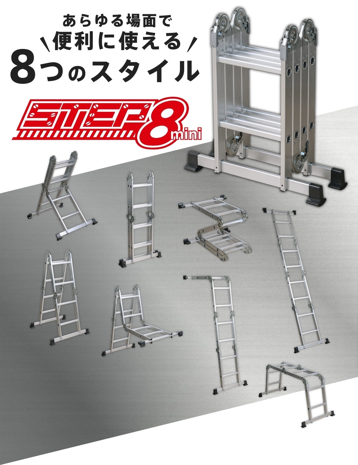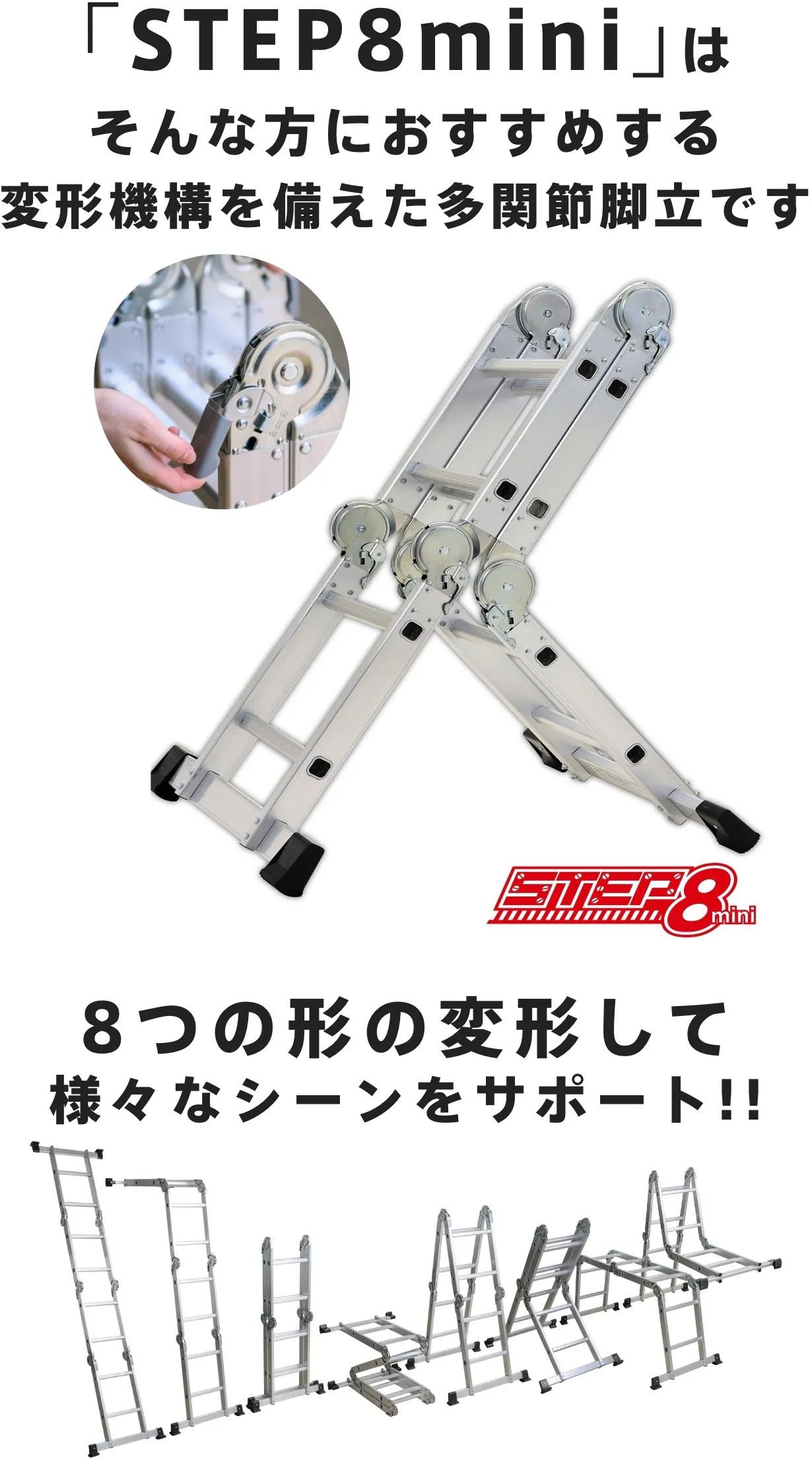 「楽しく、健康に生きる」をテーマに、日本中の暮らしに役立つ製品をお送りする企業「プライムダイレクト」より、3つの関節機構により8つの変形、様々なスタイル・シーンに使いやすいアレンジをしながら使える「STEP8mini」が登場!