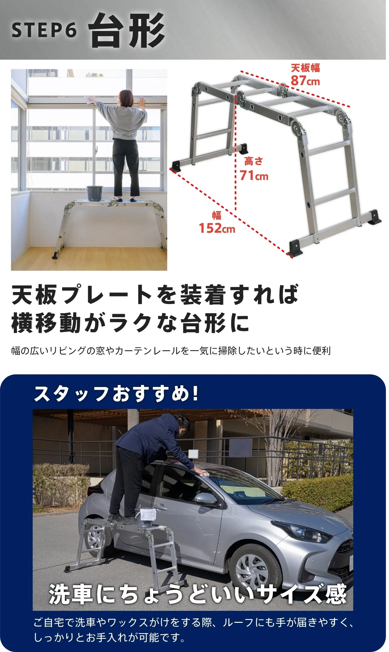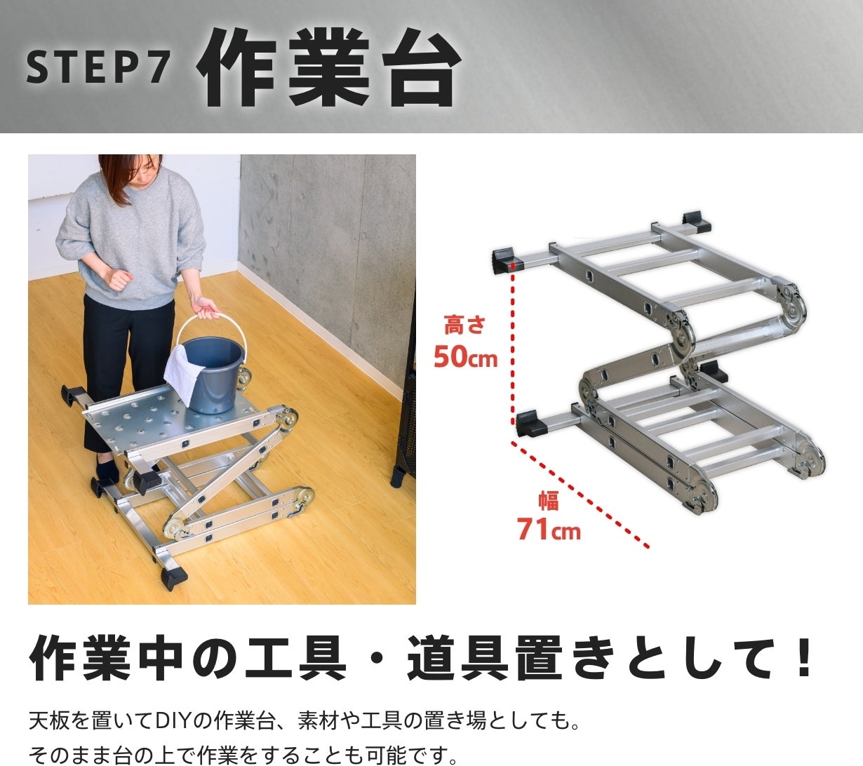 組み合わせることで、足場として踏ん張りを効かせたり、道具や工具置き場として使えばいちいち上ったり下りたりがなくなって作業が捗るんです。
