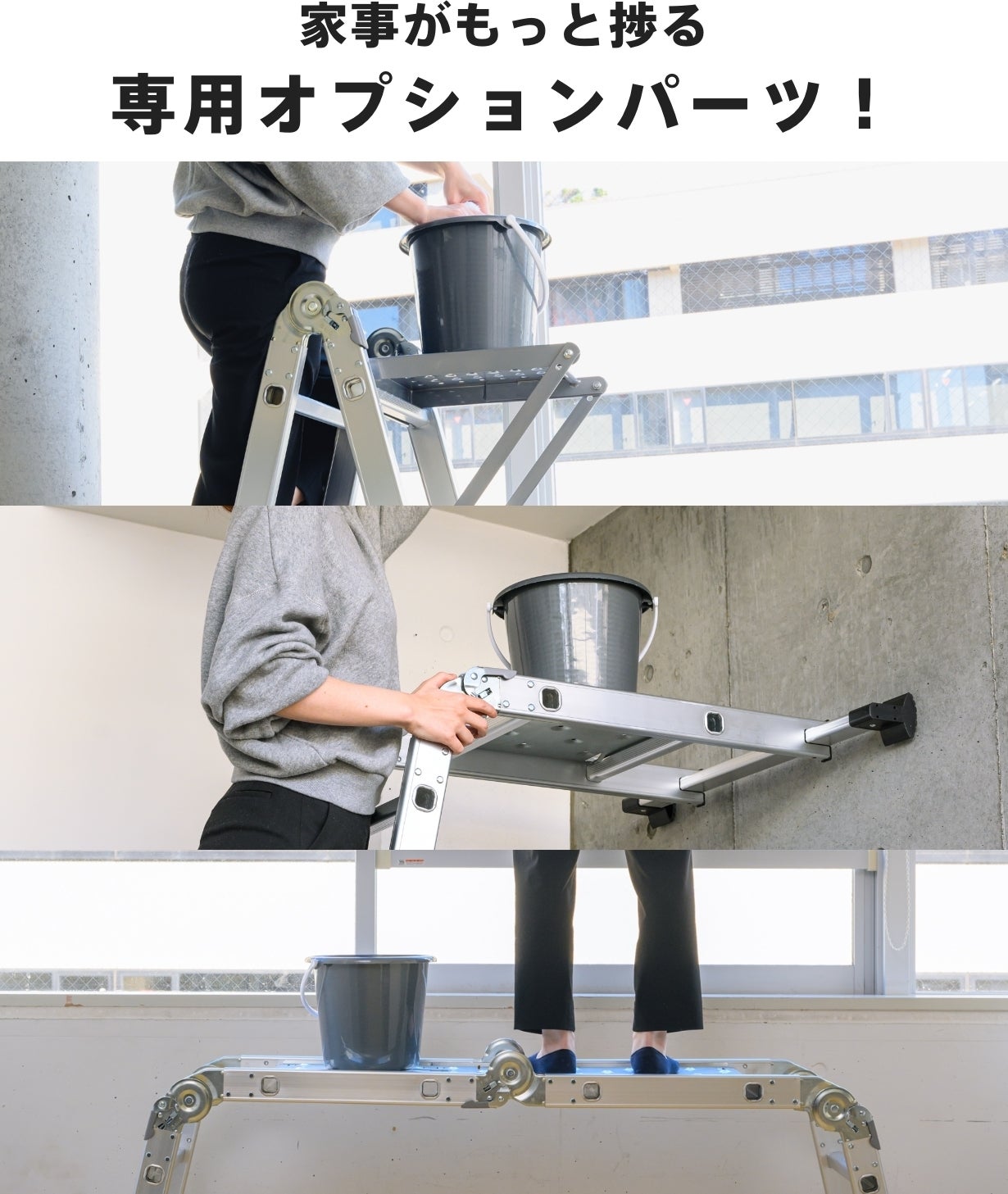 掃除道具や工具を一緒に上げられるから、雑巾絞りや工具交換のために下りて、移動してまた上って…などの動きがなくなります。