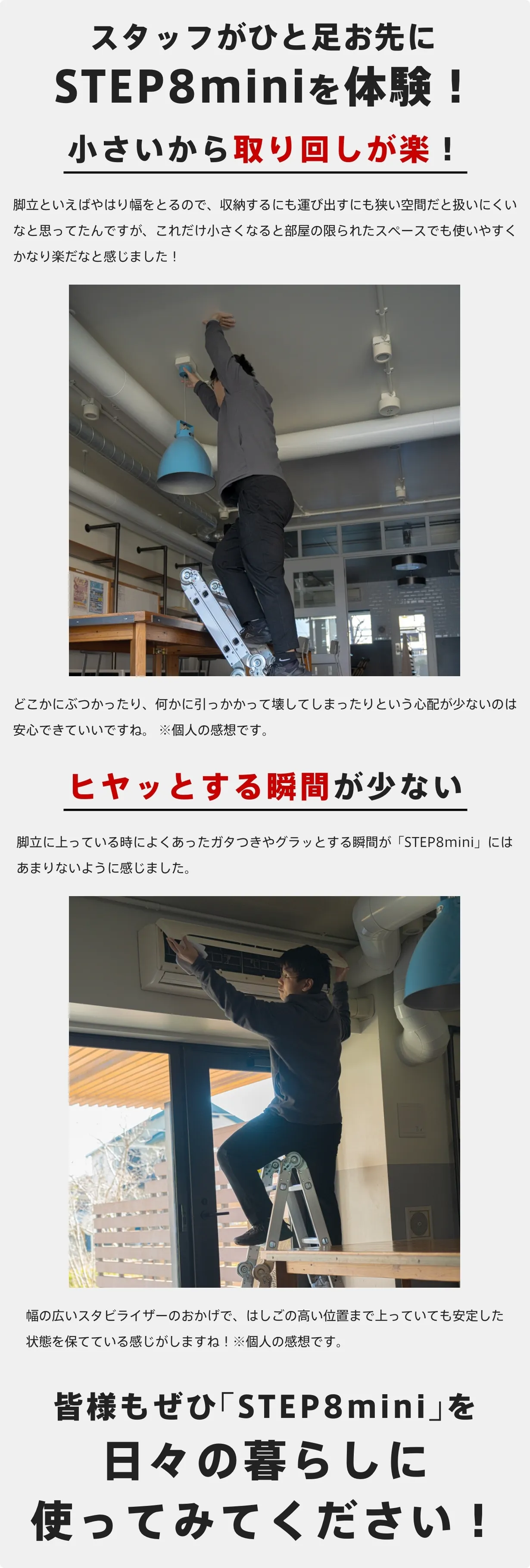 「STEP8mini」はアルミ製8kgの軽量設計、さらにコンパクトな状態で持ち運べるから、女性やご年配の方でも取り回しやすいのも大きなポイント。