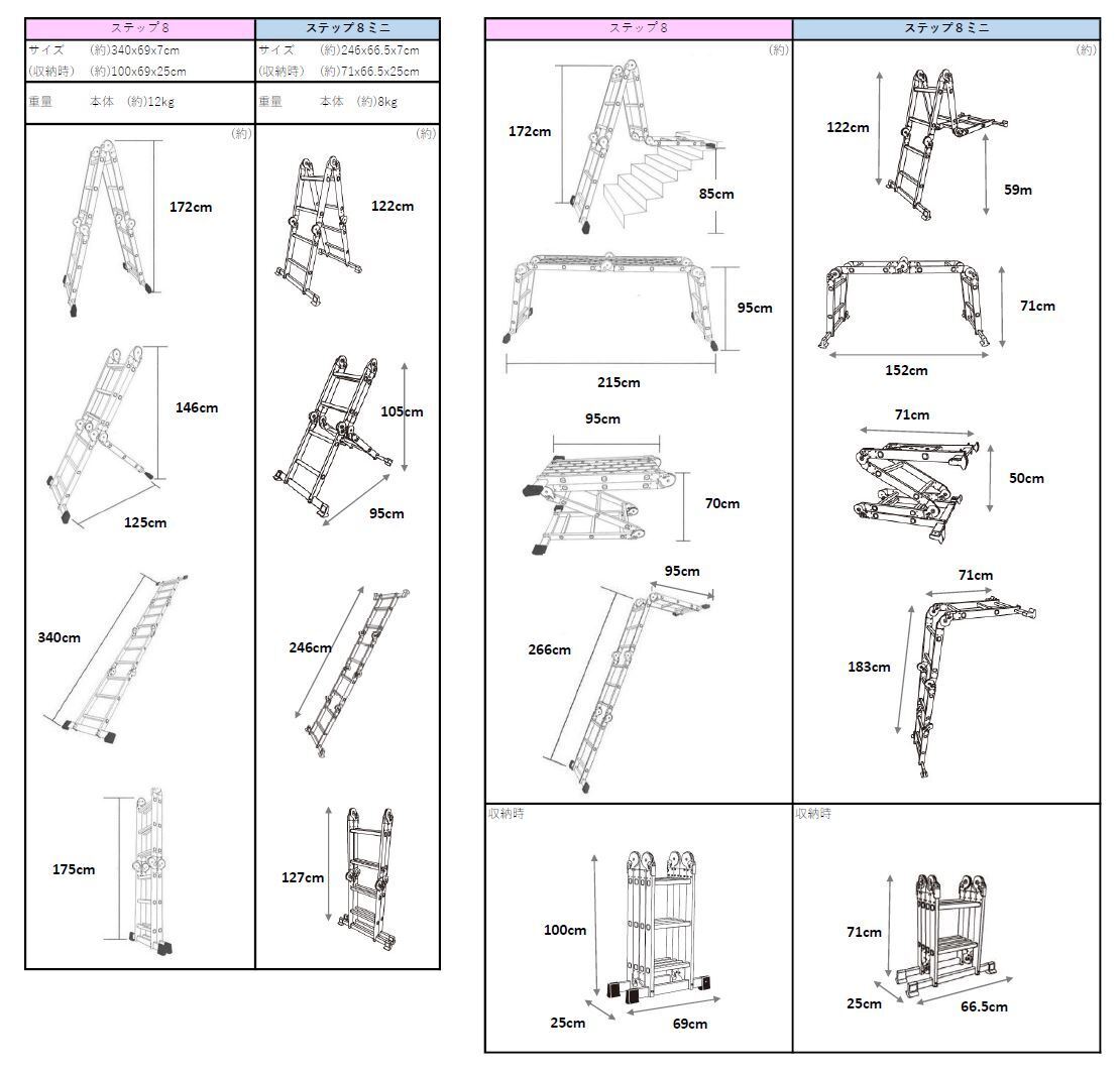 ご検討中の皆さまに従来品ステップ8と、ステップ8ミニのスペック比較表を作成しましたので、ご案内いたします。大好評、従来品のステップ8は、2019年に日本上陸した8段変形脚立。最大3.4m、大きなはしごとして使えるほか特長である8種類の変形で様々なシーンで大活躍。これまでTVショッピング、EC、店頭などで見られた方もいらっしゃるのでは!?ステップ8ミニは、より日本の住環境に合うものを、と8種類の変形と、耐荷重はそのままに。サイズを一回りコンパクトに、本体重量も軽量になっています。屋内で使用される方にオススメです。コンパクトになった事で収納もスッキリ。屋外でも使いたいという方はステップ8を主に屋内で、という方はステップ8ミニがおすすめです★ご検討お願いいたします。<参考>ステップ8 ※プライムダイレクト公式ECサイトhttps://www.primedirect.jp/step_eight.html
