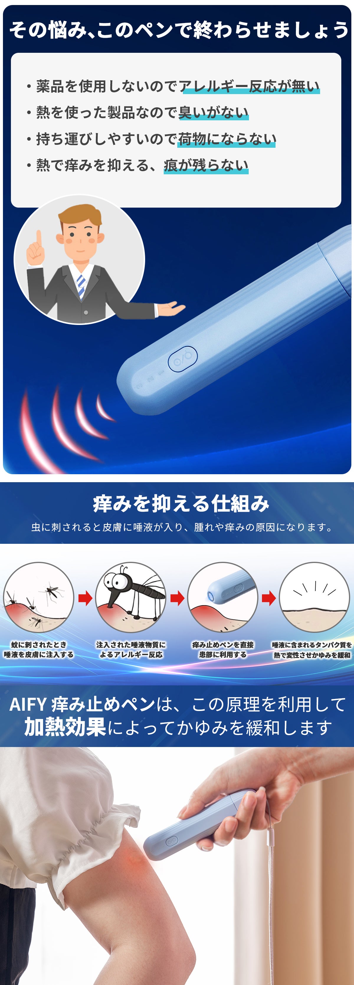 痒み止めペンは直接患部に利用し、温度が皮膚に与える影響を利用してかゆみを和らげます。