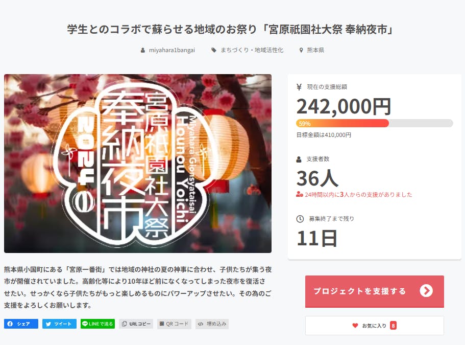 2024/07/20 16:02皆さまのおかげさまで、折り返しを超え60%目前となりました。30人以上の方にご支援いただき、夜市の準備にもますます力が入ります!本当に皆様ありがとうございます。いよいよ週明けに夜市が迫ってまいりました。皆様の応援にこたえられる素敵な夏の一日にしたいと思います!どうぞ引き続きよろしくお願いします。宮原祇園社大祭奉納夜市 実行委員一同 もっと見る