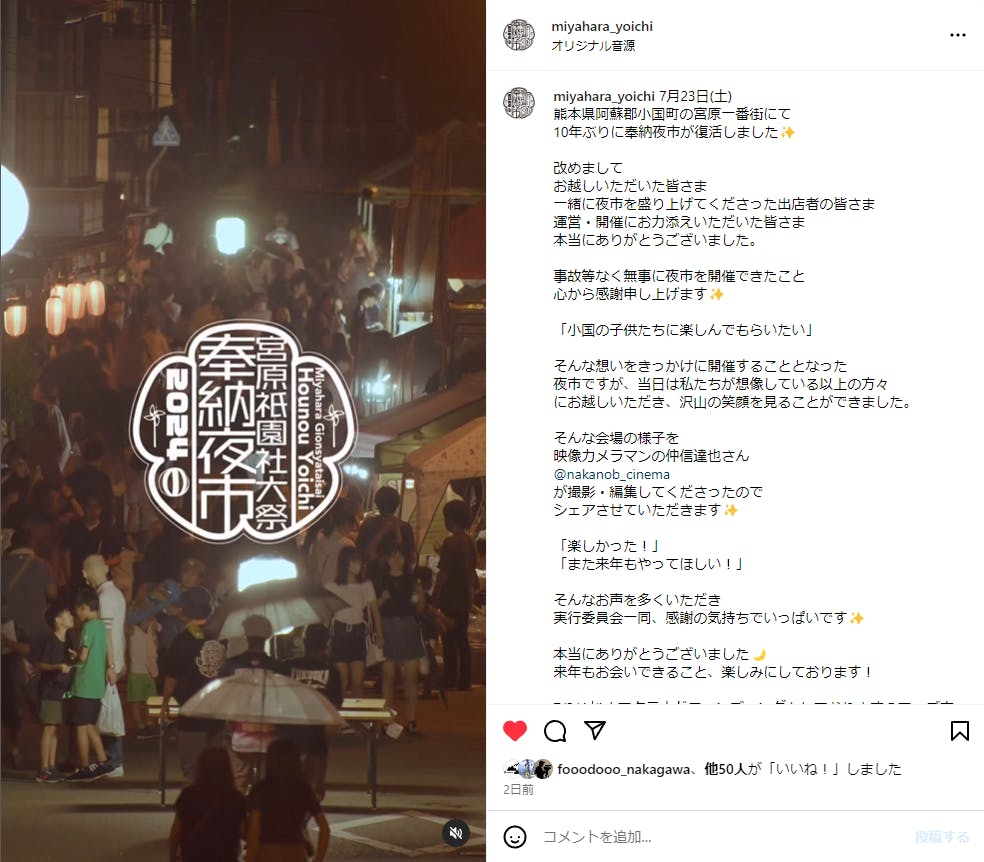 2024/07/28 14:2623日に行われました「宮原祇園社大祭奉納夜市」無事に終了いたしました!!皆様の応援まことにありがとうございました。当日の雰囲気をインスタグラムから少しだけお楽しみください。クラウドファンディングはもう少しだけ続きますので皆様の応援引き続きよろしくお願いいたします。実行委員一同 もっと見る