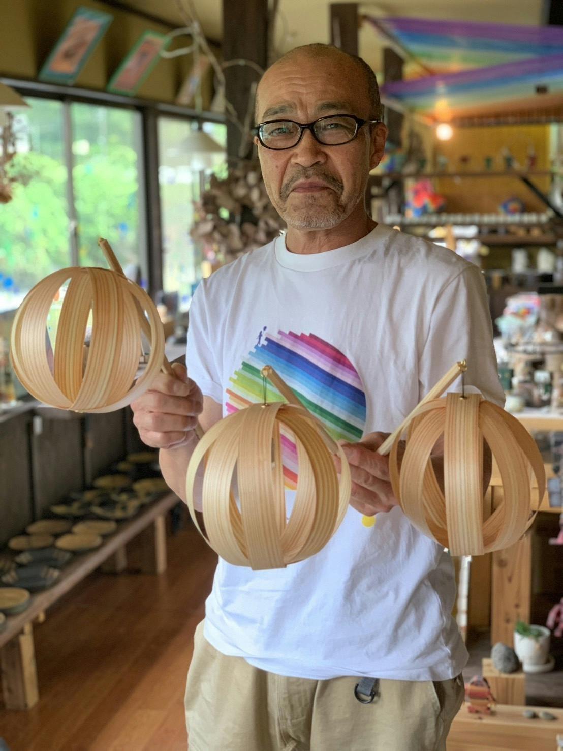 美しい水面と小国杉ランタンの柔らかな灯りをデザインするレインボー岡山さんは美術の先生をしながら夢を追うレインボーアーティスト。